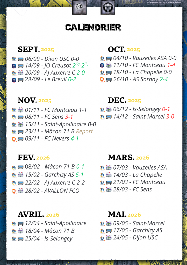 Retrouvez le calendrier de R1 Herbelin des forgerons du FC Gueugnon