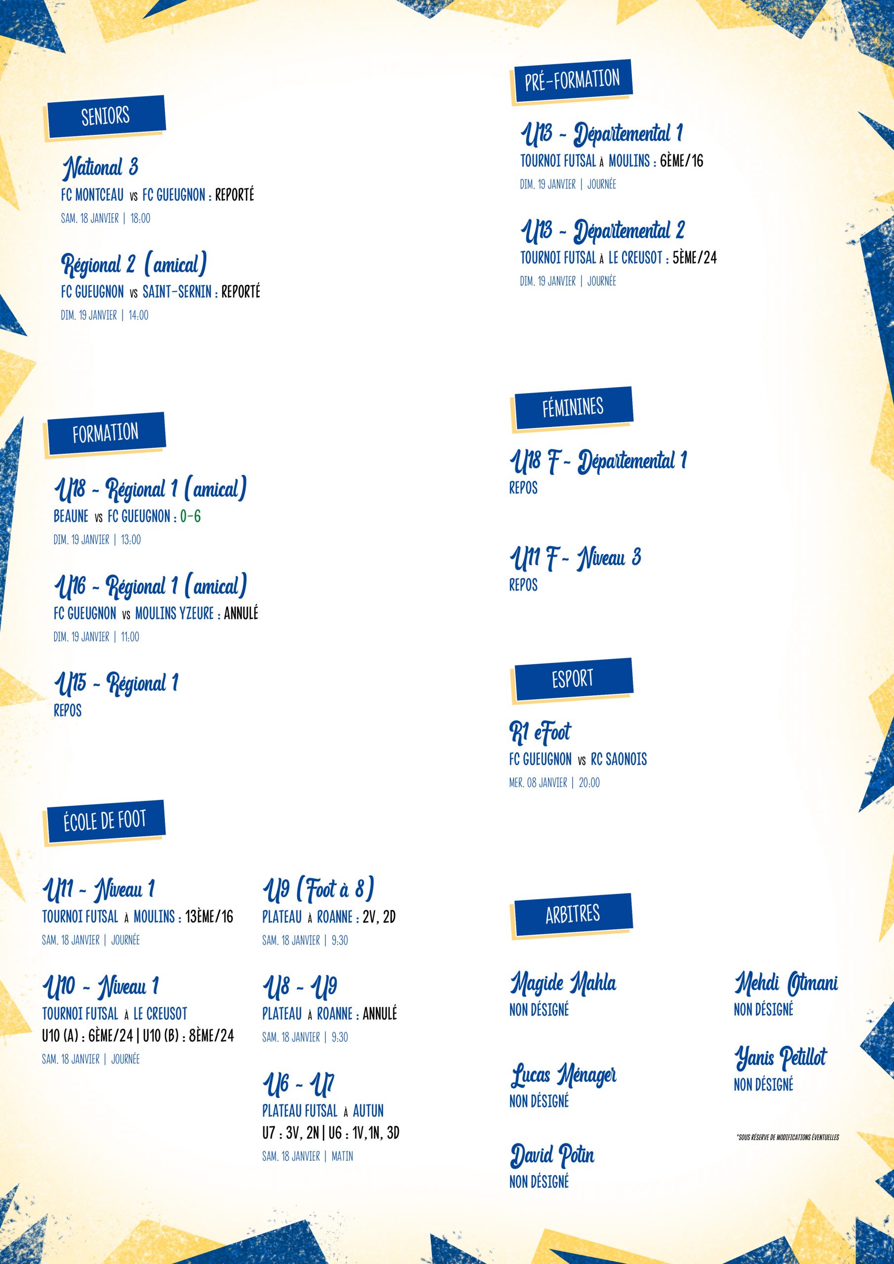 [Agenda] Les résultats du weekend du 18 et 19 janvier 2025 20 janvier 2025 Catégories News, News 2024/2025 #ForgeronFamily PLUS D'ACTUALITÉS... 1 octobre 2025[Podcast] Jason Luanda : « La Coupe de France, c’est ça aussi : des équipes dites inférieures capables de créer des exploits. Nous, on ne voulait pas vivre ça aujourd’hui. »Lire 1 octobre 2025[Agenda] Weekend du 04 et 05 Octobre 2025Lire 30 septembre 2025[Calendrier] Tirage de la Coupe de France et GambardellaLire 30 septembre 2025[E.Leclerc Académie] Séances découvertes pour les catégories U6-U7LireA LA UNE 1