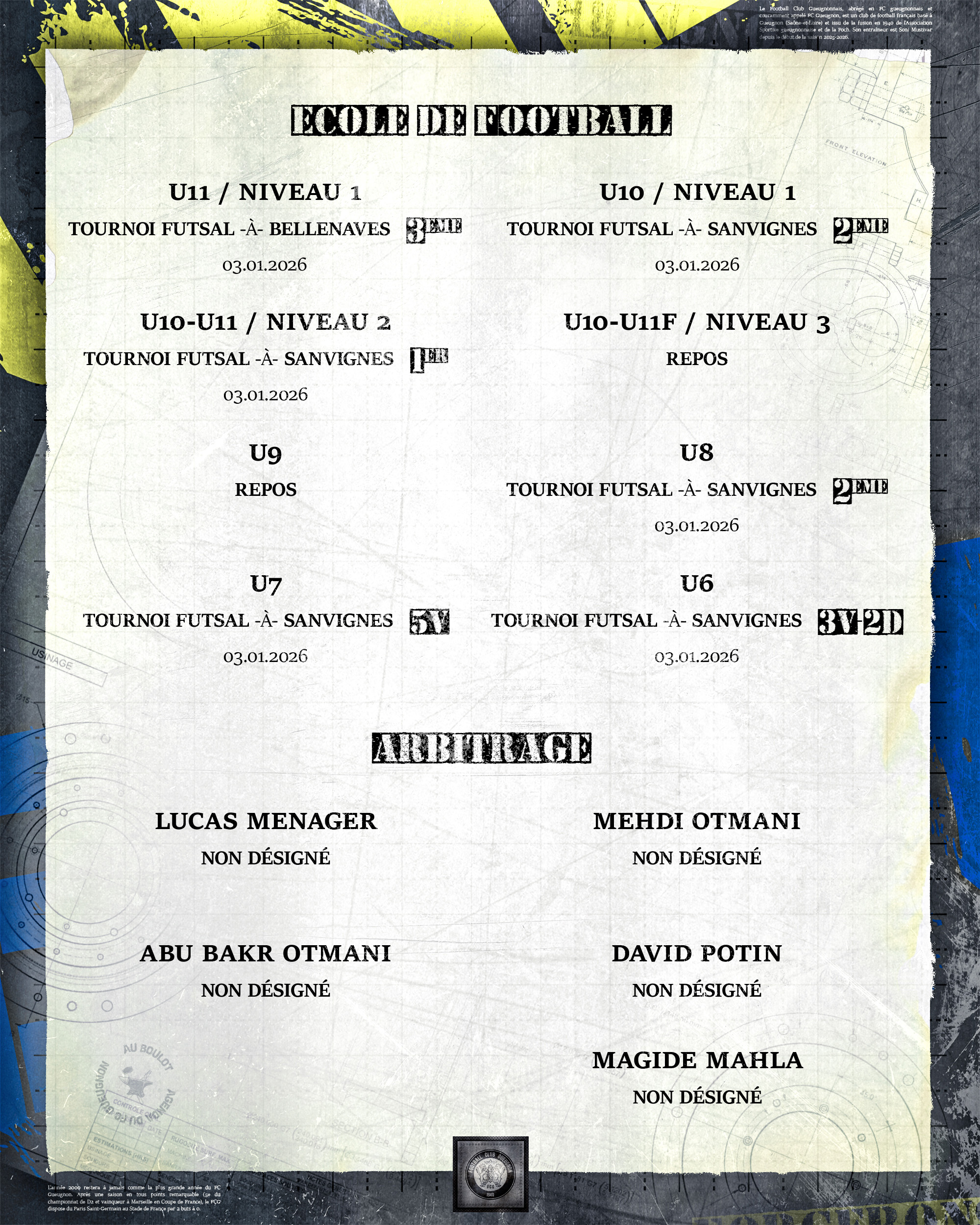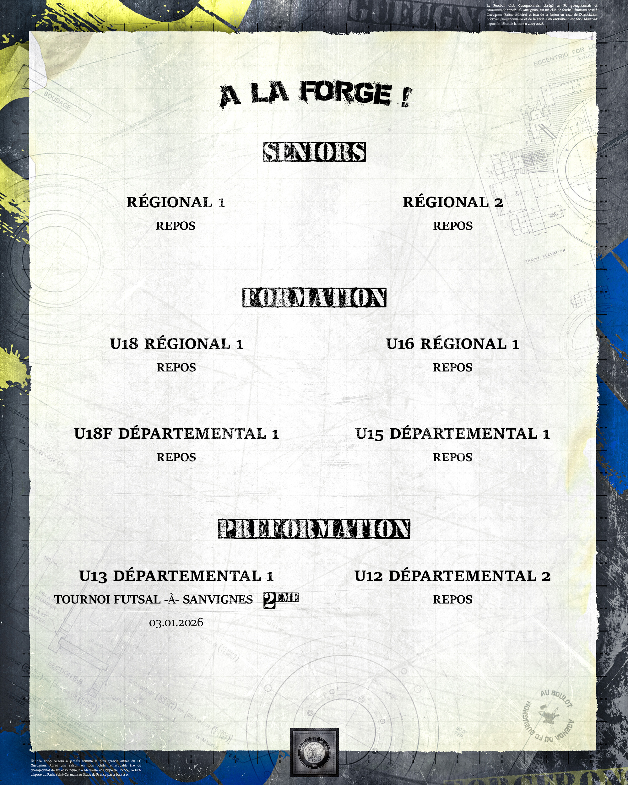 [Agenda] Résultats du weekend du 03 et 04 Janvier 2026 5 janvier 2026 Catégories News, News 2025/2026 #ForgeronFamily PLUS D'ACTUALITÉS... 13 février 2026[R1 J11 : FC Gueugnon – AS Garchizy] From Gueugnon with love !Lire 13 février 2026[R1 J11 : FC Gueugnon – AS Garchizy] L’Escale : partenaire de la rencontreLire 11 février 2026[Podcast] Morad BENAMEUR : « Ce qu’il faut retenir, c’est la solidité et la solidarité que l’on a eu. »Lire 11 février 2026[Agenda] Weekend du 14 et 15 Février 2026LireA LA UNE 1