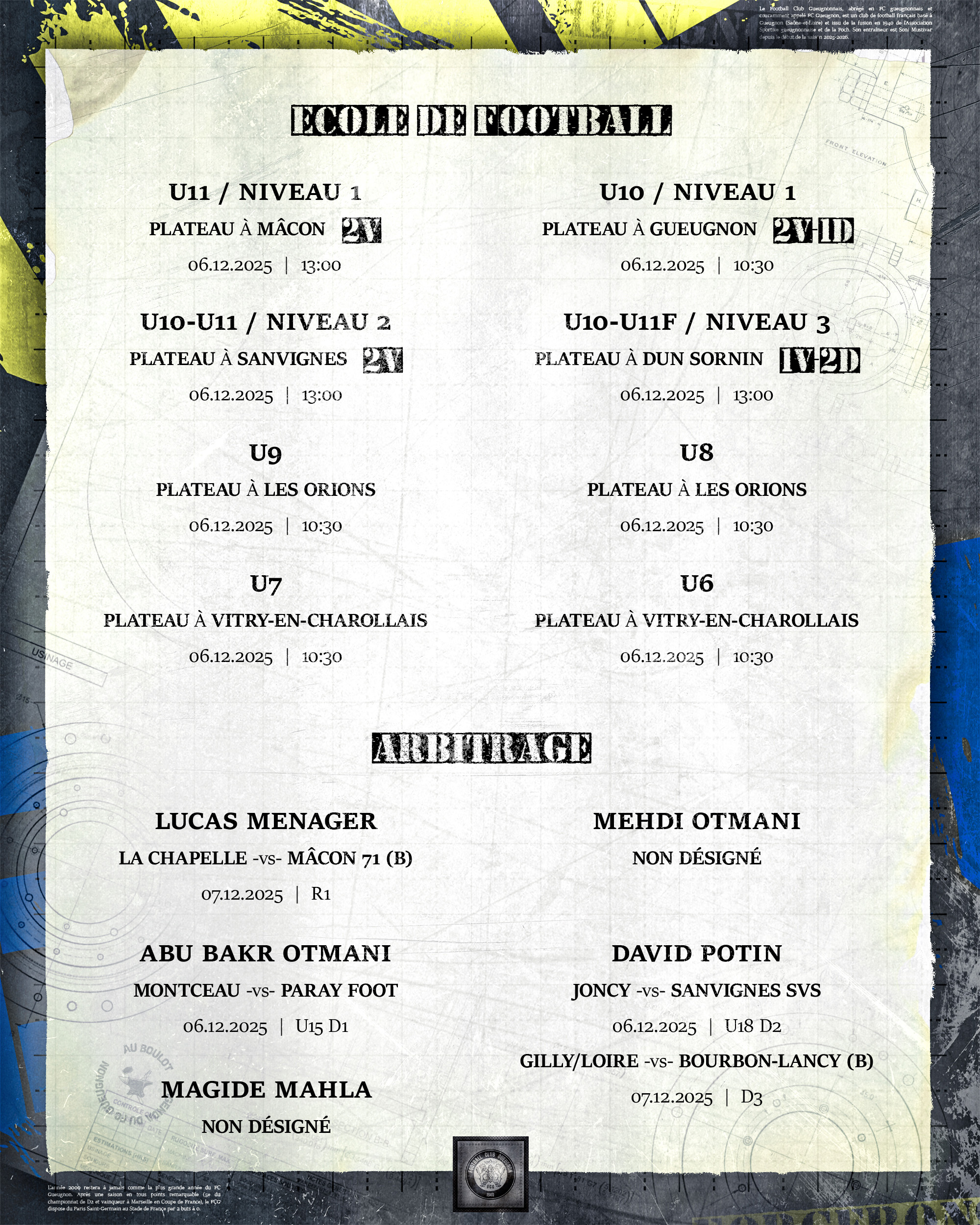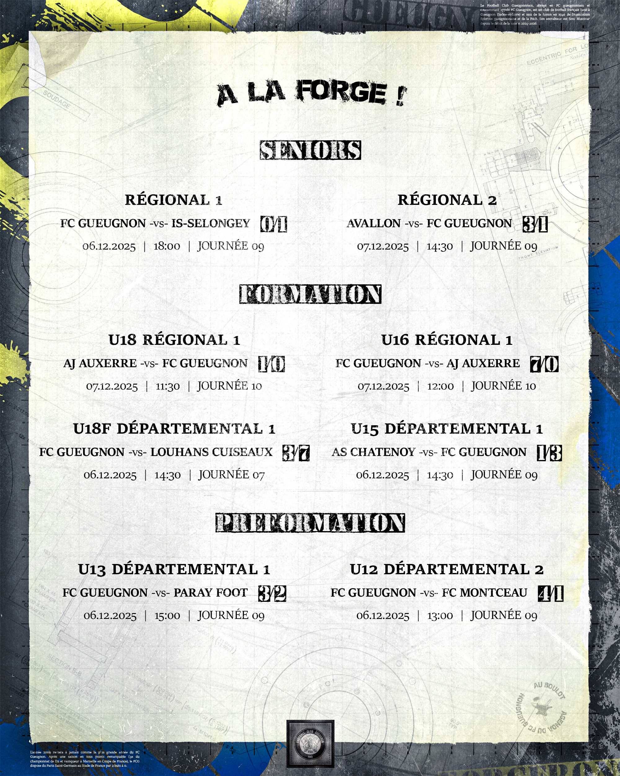 [Agenda] Résultats du weekend du 06 et 07 Décembre 2025 8 décembre 2025 Catégories News, News 2025/2026 #ForgeronFamily PLUS D'ACTUALITÉS... 9 décembre 2025[R1 J09 : FC Gueugnon – Is-Selongey] La Caisse d’Épargne : partenaire de la rencontreLire 8 décembre 2025[Agenda] Résultats du weekend du 06 et 07 Décembre 2025Lire 6 décembre 2025[R1 J09 : FC Gueugnon – Is-Selongey] Flash ScoreLire 5 décembre 2025[Forgeron APERAM] Votez pour le Forgeron du mois de Novembre 2025LireA LA UNE 1