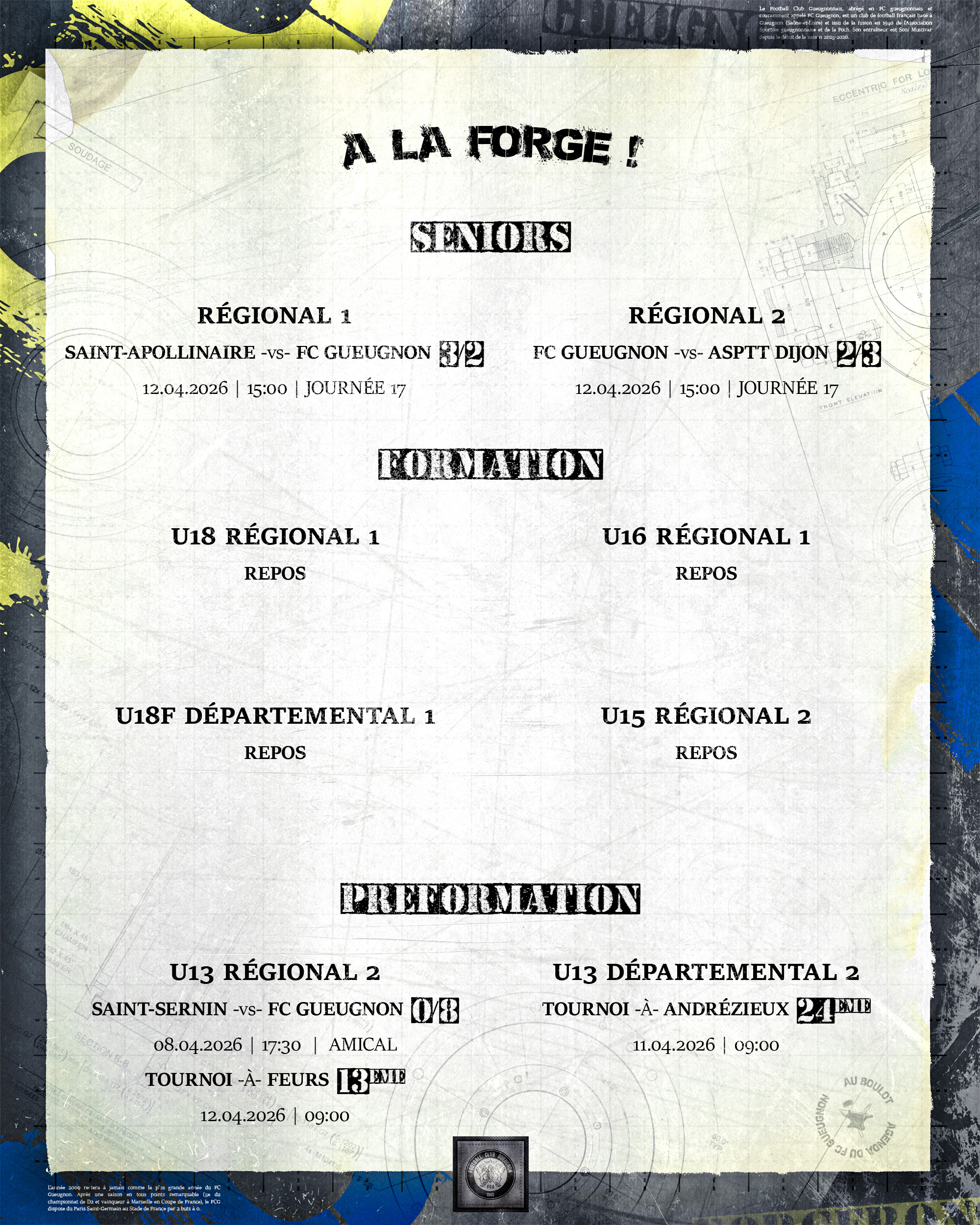 [Agenda] Résultats du weekend du 11 et 12 Avril 2026 13 avril 2026 Catégories News, News 2025/2026 #ForgeronFamily PLUS D'ACTUALITÉS... 13 avril 2026[Agenda] Résultats du weekend du 11 et 12 Avril 2026Lire 12 avril 2026[R1 J17 : ASC St Apollinaire – FC Gueugnon] Flash ScoreLire 10 avril 2026[R1 J17 : ASC St Apollinaire – FC Gueugnon] Direction St Apo pour des Forgerons déterminés !Lire 8 avril 2026[Agenda] Weekend du 11 et 12 Avril 2026LireA LA UNE 1