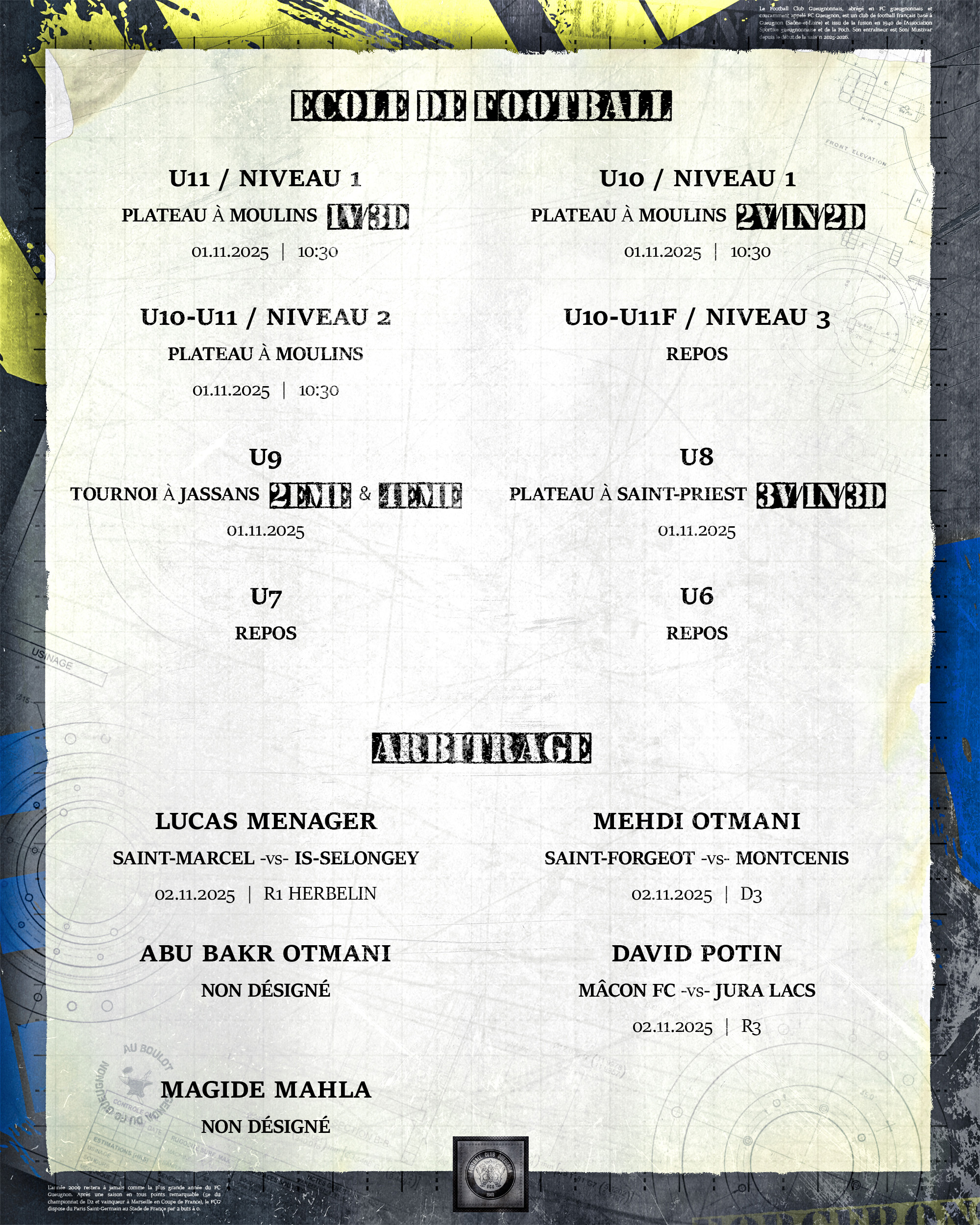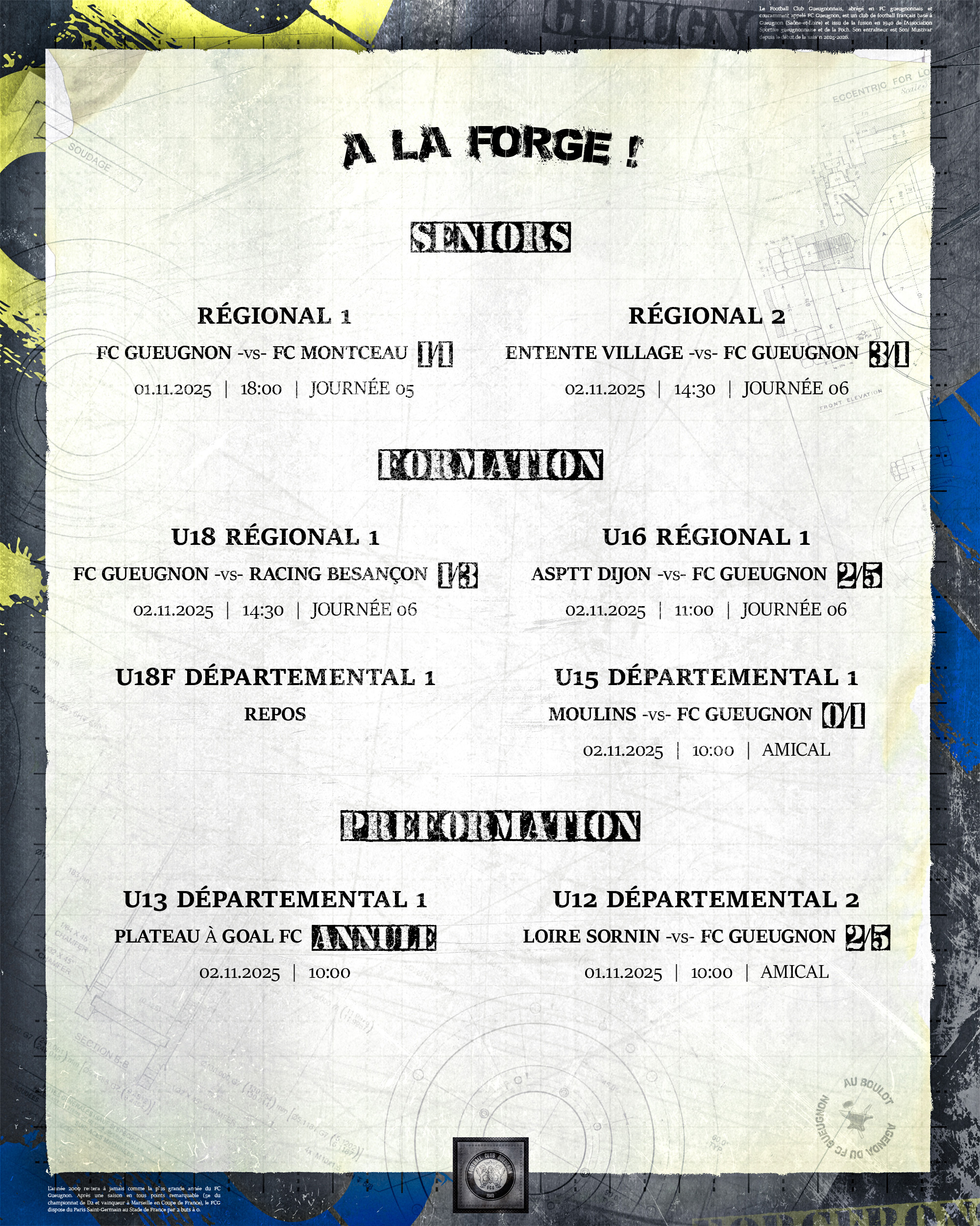 [Agenda] Résultats du weekend du 1er et 02 Novembre 2025 3 novembre 2025 Catégories News, News 2025/2026 #ForgeronFamily PLUS D'ACTUALITÉS... 5 novembre 2025[Agenda] Weekend du 08 et 09 Novembre 2025Lire 4 novembre 2025[R1 J05 : FC Gueugnon – FC Montceau] Décopub-71 : partenaire de la rencontreLire 3 novembre 2025[Agenda] Résultats du weekend du 1er et 02 Novembre 2025Lire 1 novembre 2025[R1 J05 : FC Gueugnon – FC Montceau] Flash ScoreLireA LA UNE 1
