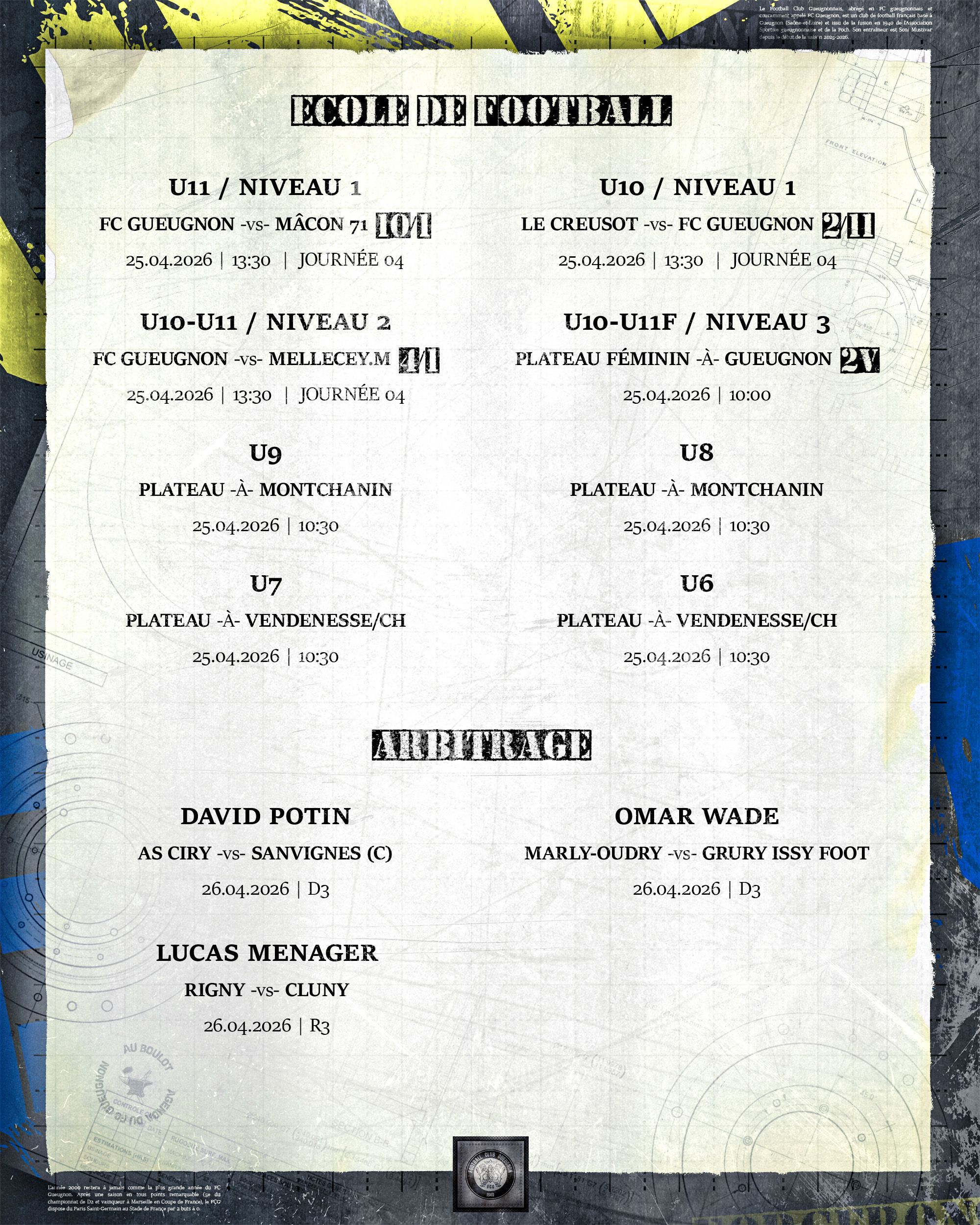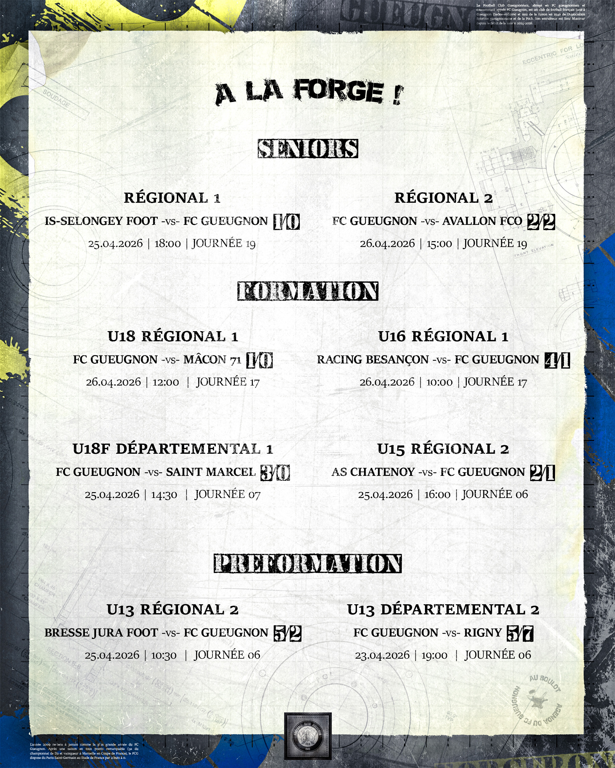 [Agenda] Résultats du weekend du 25 et 26 Avril 2026 27 avril 2026 Catégories News, News 2025/2026 #ForgeronFamily PLUS D'ACTUALITÉS... 29 avril 2026[Agenda] Weekend du 02 et 03 Mai 2026Lire 27 avril 2026[Agenda] Résultats du weekend du 25 et 26 Avril 2026Lire 25 avril 2026[R1 J19 : Is-Selongey – FC Gueugnon] Flash ScoreLire 24 avril 2026[R1 J19 : Is-Selongey – FC Gueugnon] Face au leader !LireA LA UNE 1