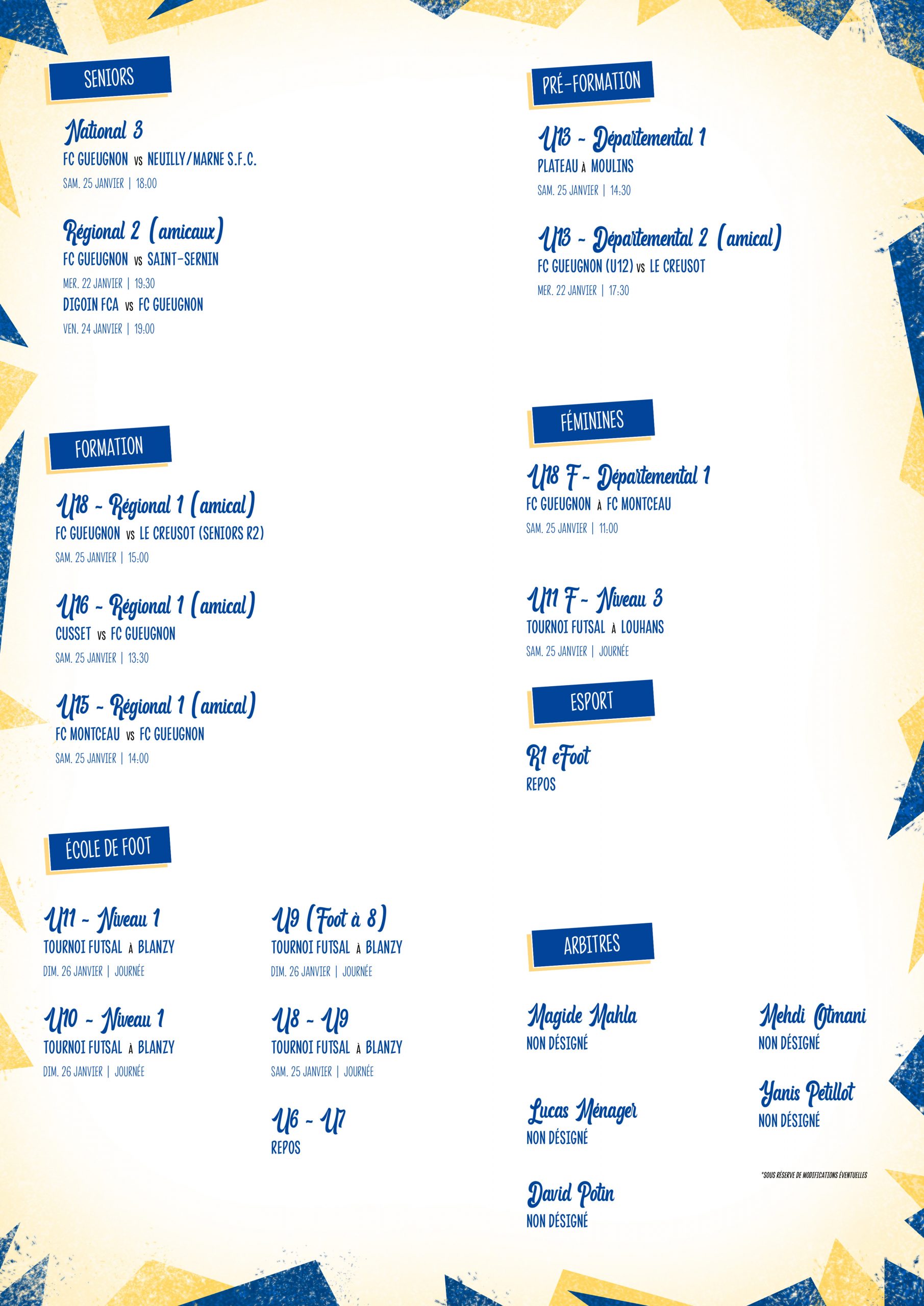 [Agenda] Week-end du 25 et 26 janvier 2025 22 janvier 2025 Catégories News, News 2024/2025 #ForgeronFamily PLUS D'ACTUALITÉS... 1 octobre 2025[Podcast] Jason Luanda : « La Coupe de France, c’est ça aussi : des équipes dites inférieures capables de créer des exploits. Nous, on ne voulait pas vivre ça aujourd’hui. »Lire 1 octobre 2025[Agenda] Weekend du 04 et 05 Octobre 2025Lire 30 septembre 2025[Calendrier] Tirage de la Coupe de France et GambardellaLire 30 septembre 2025[E.Leclerc Académie] Séances découvertes pour les catégories U6-U7LireA LA UNE 1