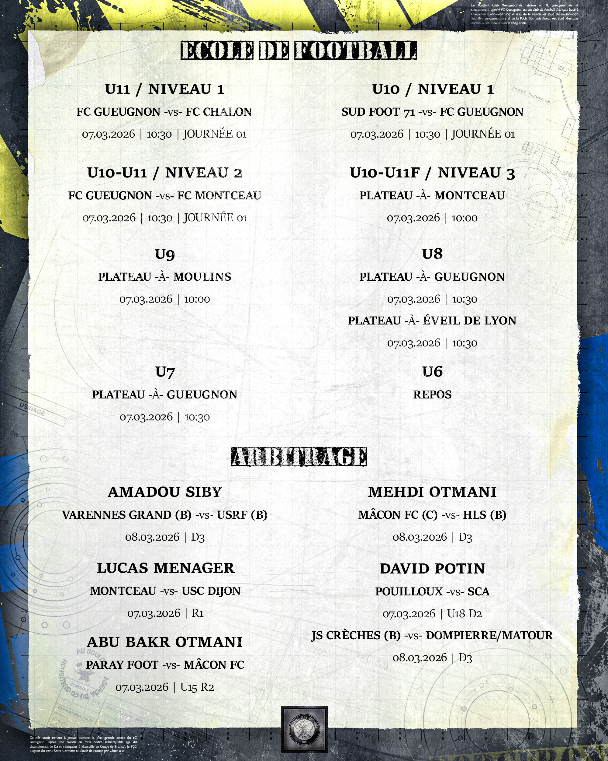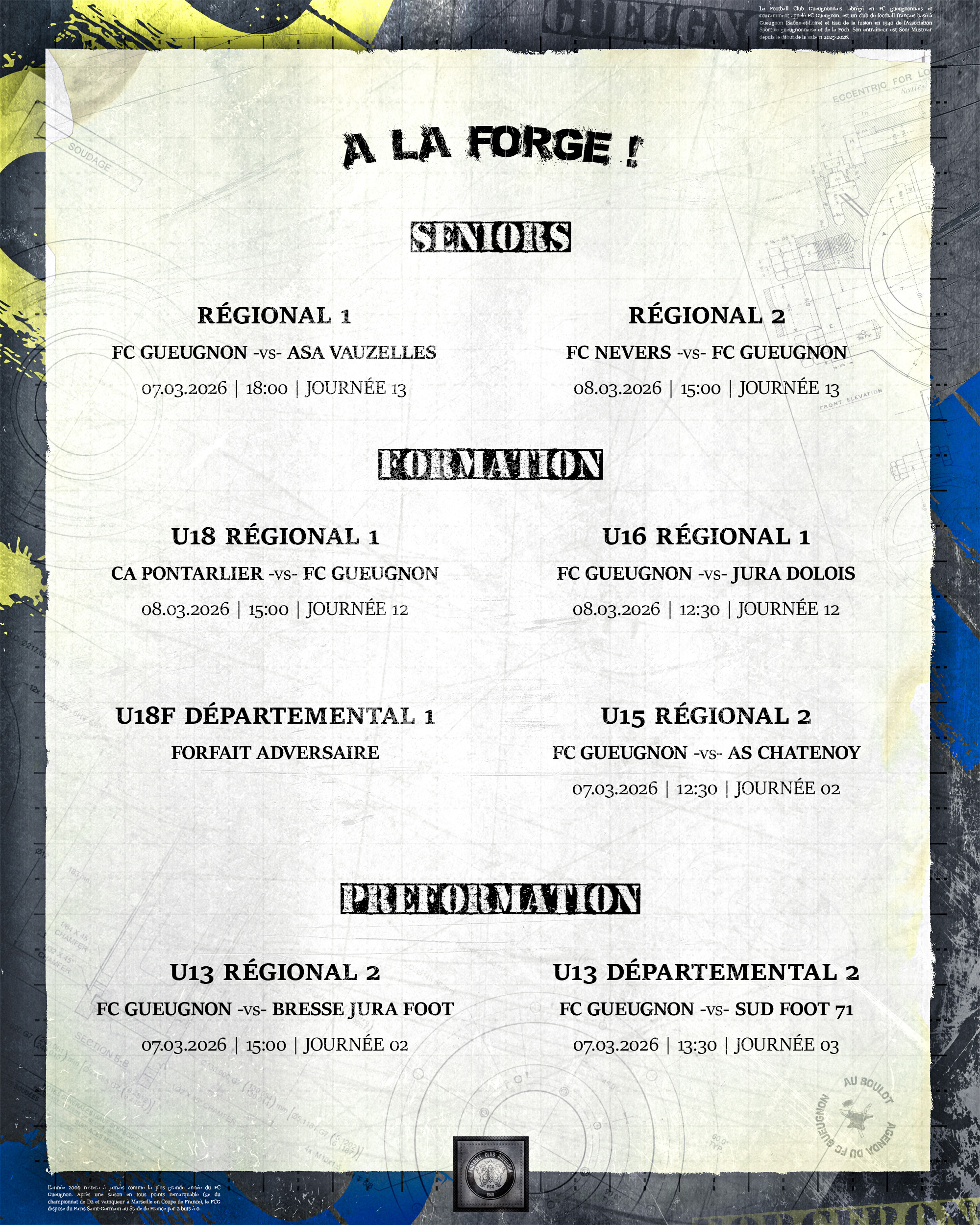 [Agenda] Weekend du 07 et 08 Mars 2026 4 mars 2026 Catégories News, News 2025/2026 #ForgeronFamily PLUS D'ACTUALITÉS... 4 mars 2026[Agenda] Weekend du 07 et 08 Mars 2026Lire 3 mars 2026[Podcast] Guy CLOPIN : « On est dans la continuité de ce qu’on propose depuis 3 matchs : avec le sérieux qu’on y met, on obtient logiquement un résultat positif. »Lire 2 mars 2026[Agenda] Résultats du weekend du 28 Février et 1er Mars 2026Lire 28 février 2026[CBFC 1/16e : FC Gueugnon – FCO Avallon] Flash ScoreLireA LA UNE 1