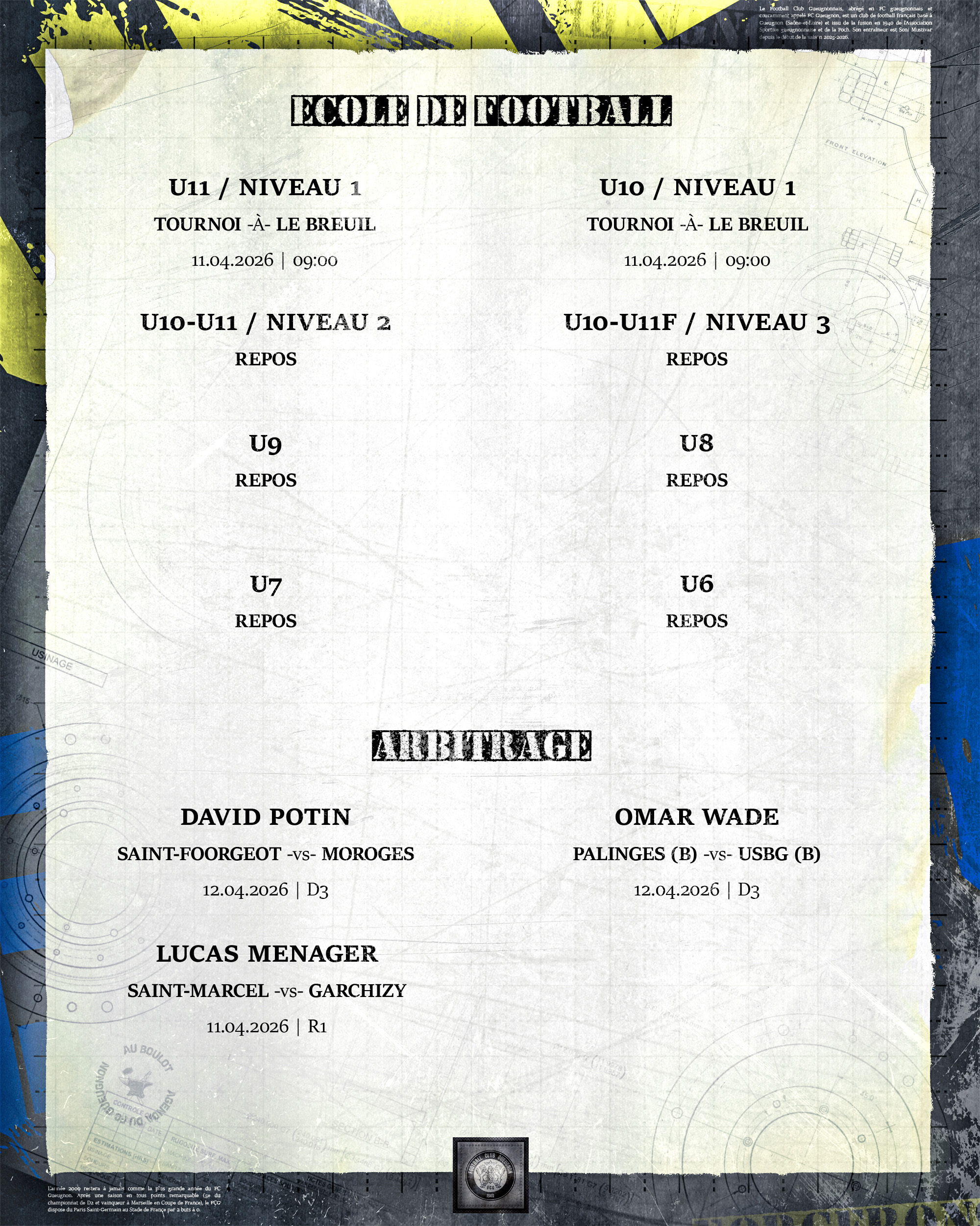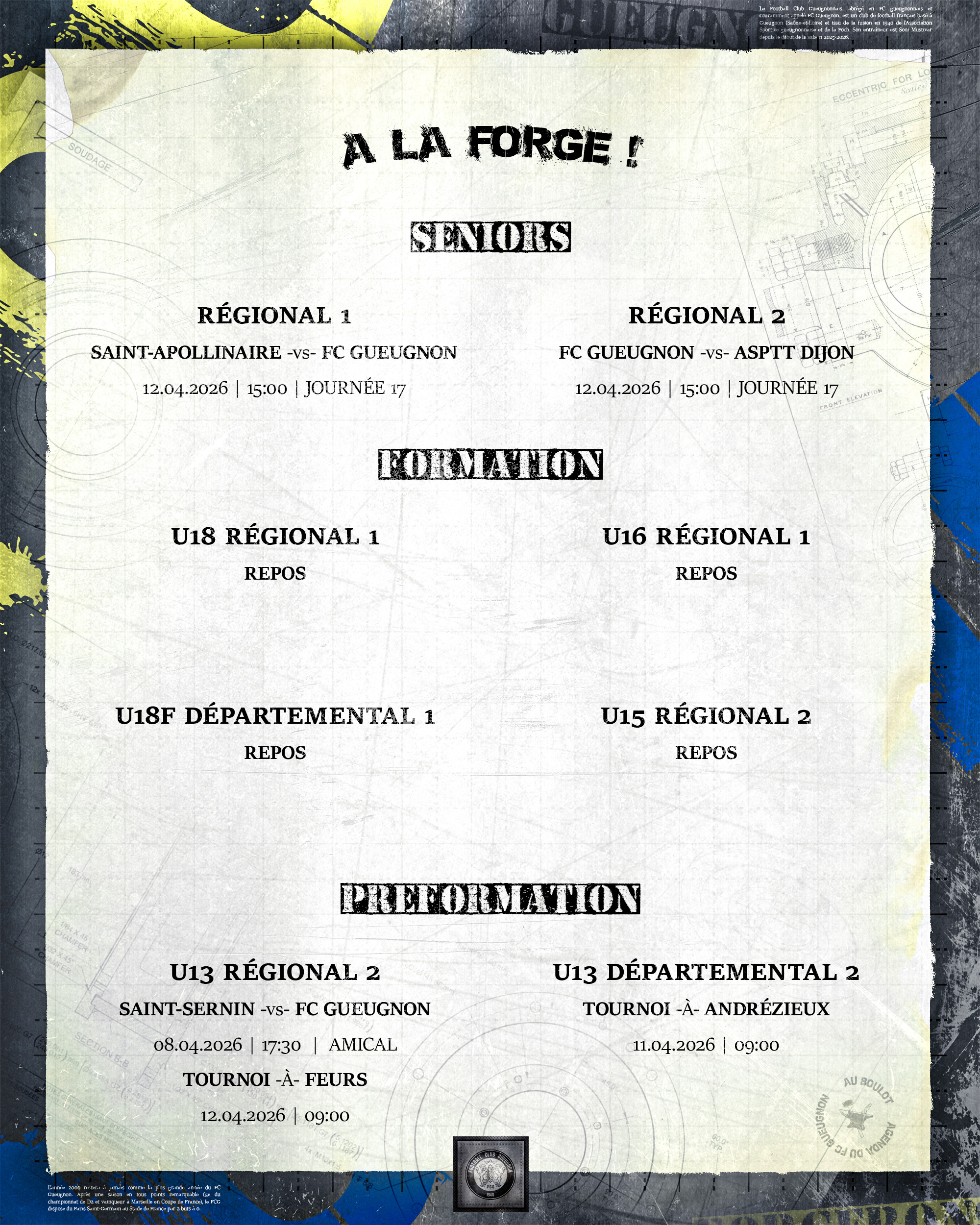 [Agenda] Weekend du 11 et 12 Avril 2026 8 avril 2026 Catégories News, News 2025/2026 #ForgeronFamily PLUS D'ACTUALITÉS... 8 avril 2026[Agenda] Weekend du 11 et 12 Avril 2026Lire 7 avril 2026[Agenda] Résultats du weekend du 04 et 05 Avril 2026Lire 3 avril 2026[CBFC 1/8 : Morteau-Montlebon – FC Gueugnon] Place à la Coupe chez un adversaire de taille !Lire 3 avril 2026[Forgeron APERAM] Votez pour le Forgeron du mois de Mars 2026LireA LA UNE 1