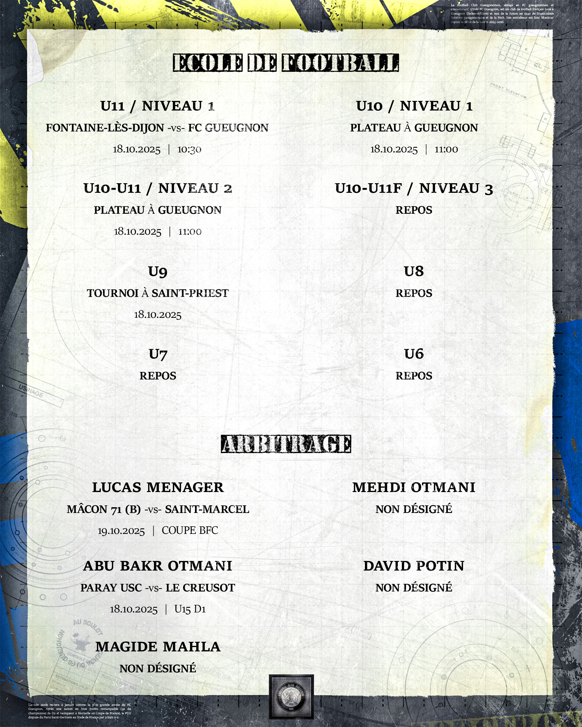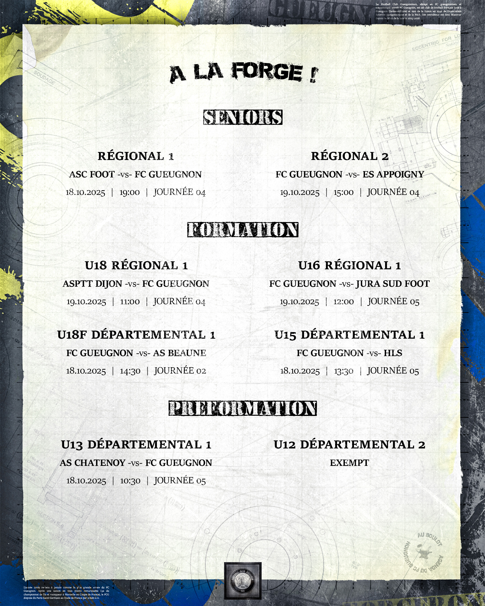 [Agenda] Weekend du 18 et 19 Octobre 2025 15 octobre 2025 Catégories News, News 2025/2026 #ForgeronFamily PLUS D'ACTUALITÉS... 15 octobre 2025[Podcast] Soni MUSTIVAR : « Un message pour les supporters : merci pour leur soutien tout au long du match… »Lire 15 octobre 2025[Agenda] Weekend du 18 et 19 Octobre 2025Lire 14 octobre 2025[Extra-sportif] Loto du FC Gueugnon le Dimanche 26 OctobreLire 13 octobre 2025[Agenda] Résultats du weekend du 11 et 12 Octobre 2025LireA LA UNE 1