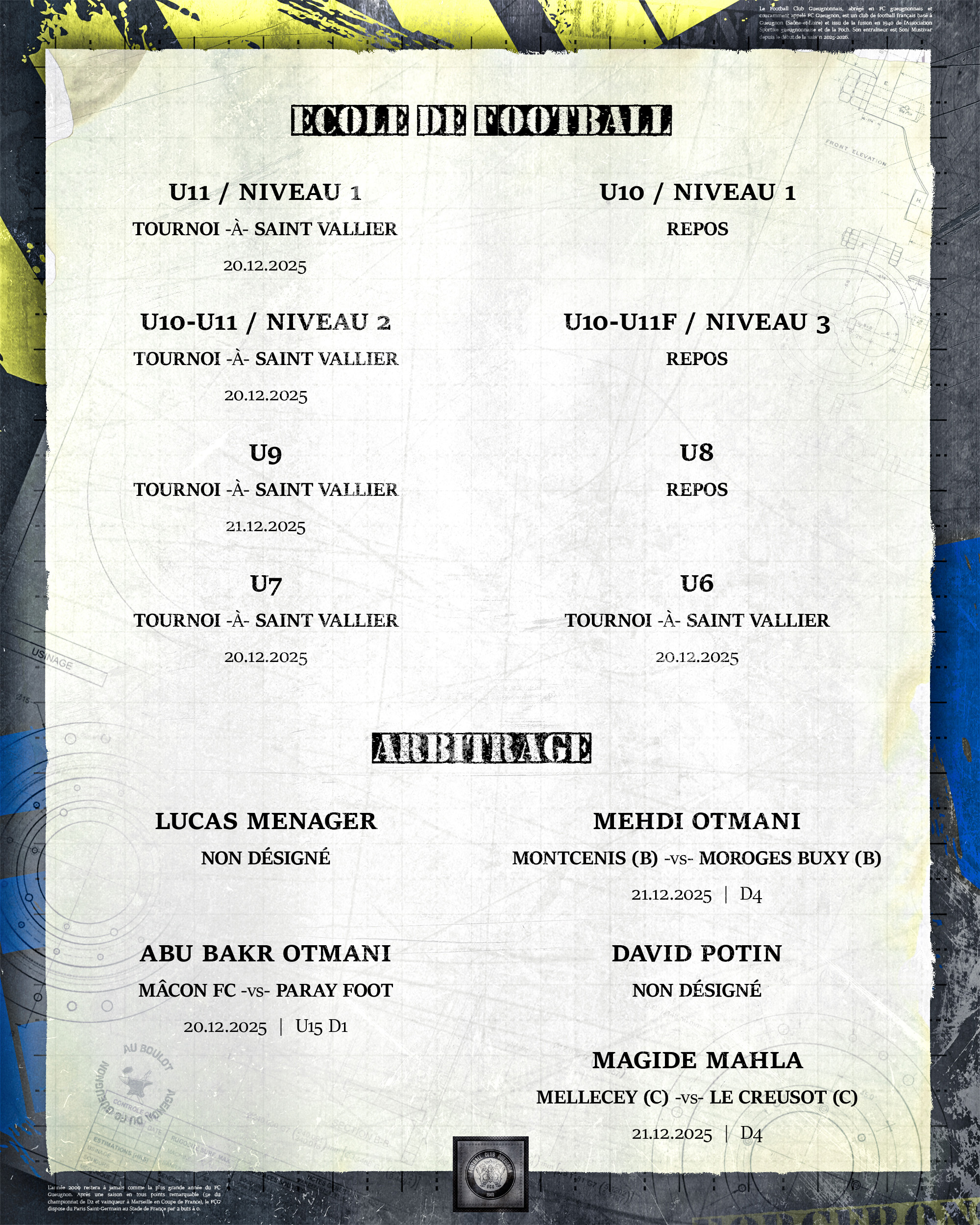 [Agenda] Weekend du 20 et 21 Décembre 2025 17 décembre 2025 Catégories News, News 2025/2026 #ForgeronFamily PLUS D'ACTUALITÉS... 17 décembre 2025[Agenda] Weekend du 20 et 21 Décembre 2025Lire 15 décembre 2025[Agenda] Résultats du weekend du 13 et 14 Décembre 2025Lire 15 décembre 2025[R1 J10 : FR St Marcel 71 – FC Gueugnon] Flash ScoreLire 12 décembre 2025[R1 J10 : FR St Marcel 71 – FC Gueugnon] Pour passer l’hiver au chaudLireA LA UNE 1