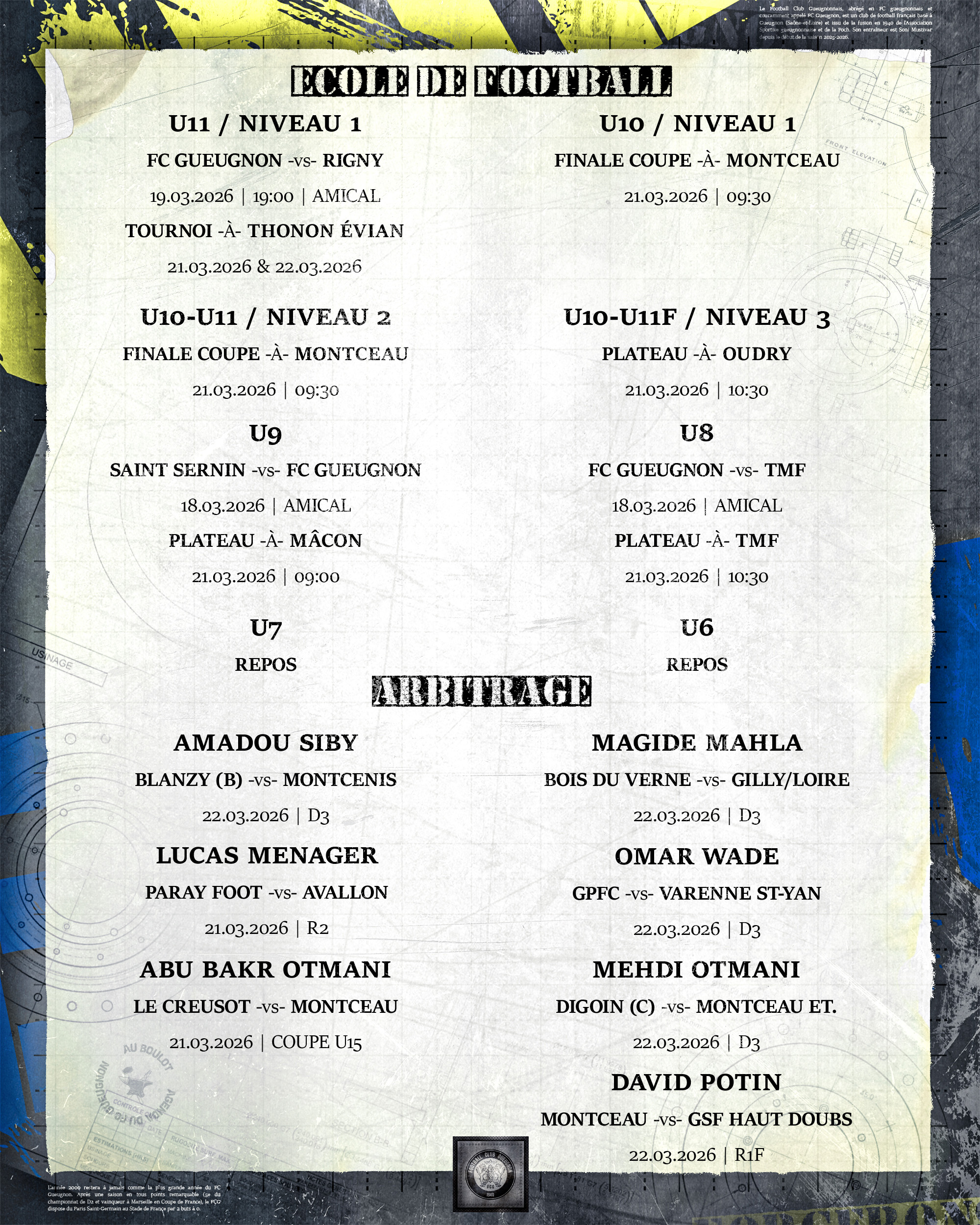 [Agenda] Weekend du 21 et 22 Mars 2026 18 mars 2026 Catégories News, News 2025/2026 #ForgeronFamily PLUS D'ACTUALITÉS... 18 mars 2026[Agenda] Weekend du 21 et 22 Mars 2026Lire 17 mars 2026[R1 J14 : FC Gueugnon – Chapelle-Guinchay] L’Amicale des Anciens du FC Gueugnon : partenaire de la rencontreLire 16 mars 2026[Agenda] Résultats du weekend du 14 et 15 Mars 2026Lire 14 mars 2026[R1 J14 : FC Gueugnon – Chapelle-Guinchay] Flash ScoreLireA LA UNE 1