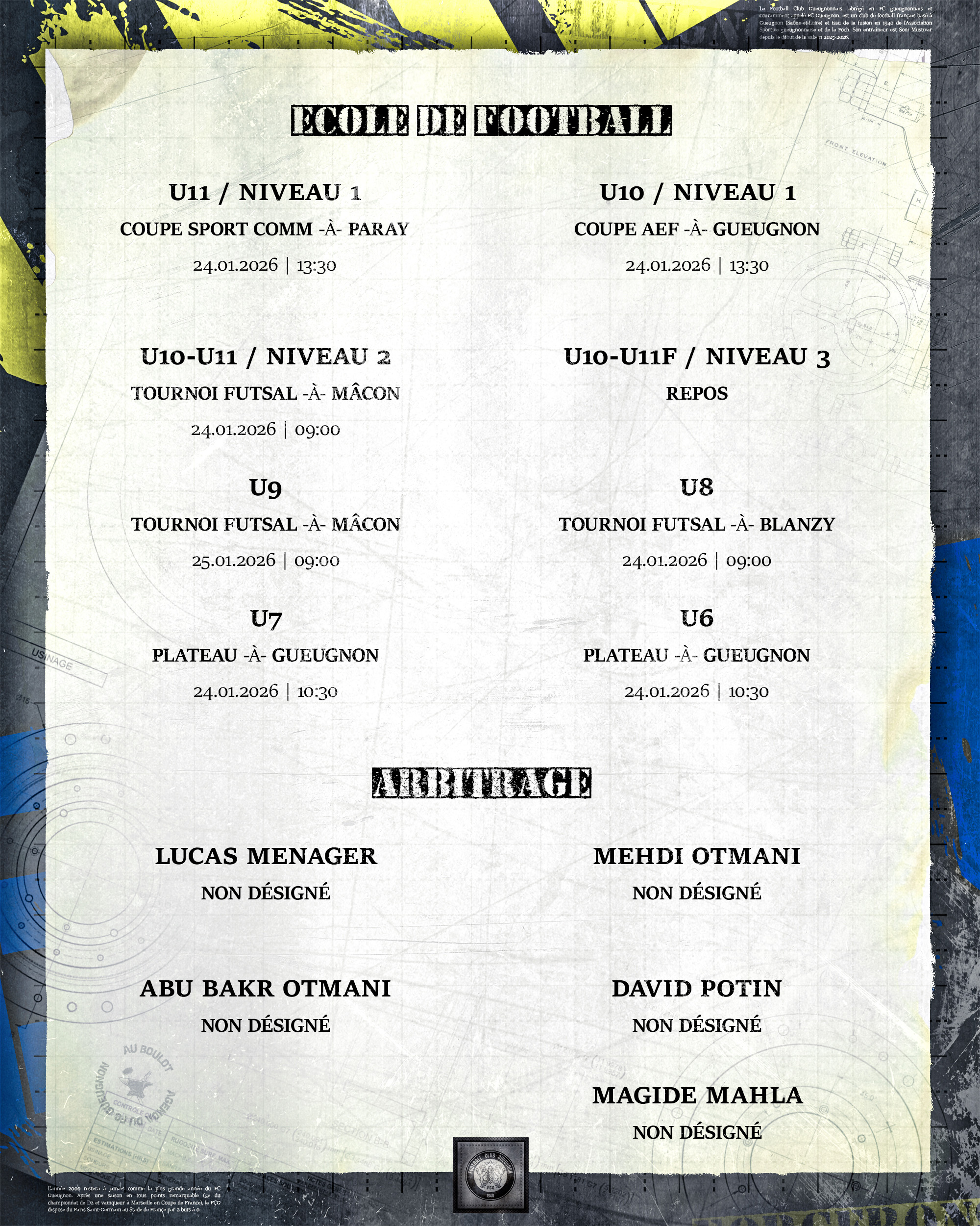 [Agenda] Weekend du 24 et 25 Janvier 2026 21 janvier 2026 Catégories News, News 2025/2026 #ForgeronFamily PLUS D'ACTUALITÉS... 21 janvier 2026[Agenda] Weekend du 24 et 25 Janvier 2026Lire 19 janvier 2026[Agenda] Résultats du weekend du 17 et 18 Janvier 2026Lire 16 janvier 2026[E.Leclerc Académie] Portes ouvertes de l’École de FootLire 15 janvier 2026[Extra-sportif] Loto du FC Gueugnon le Dimanche 1er FévrierLireA LA UNE 1