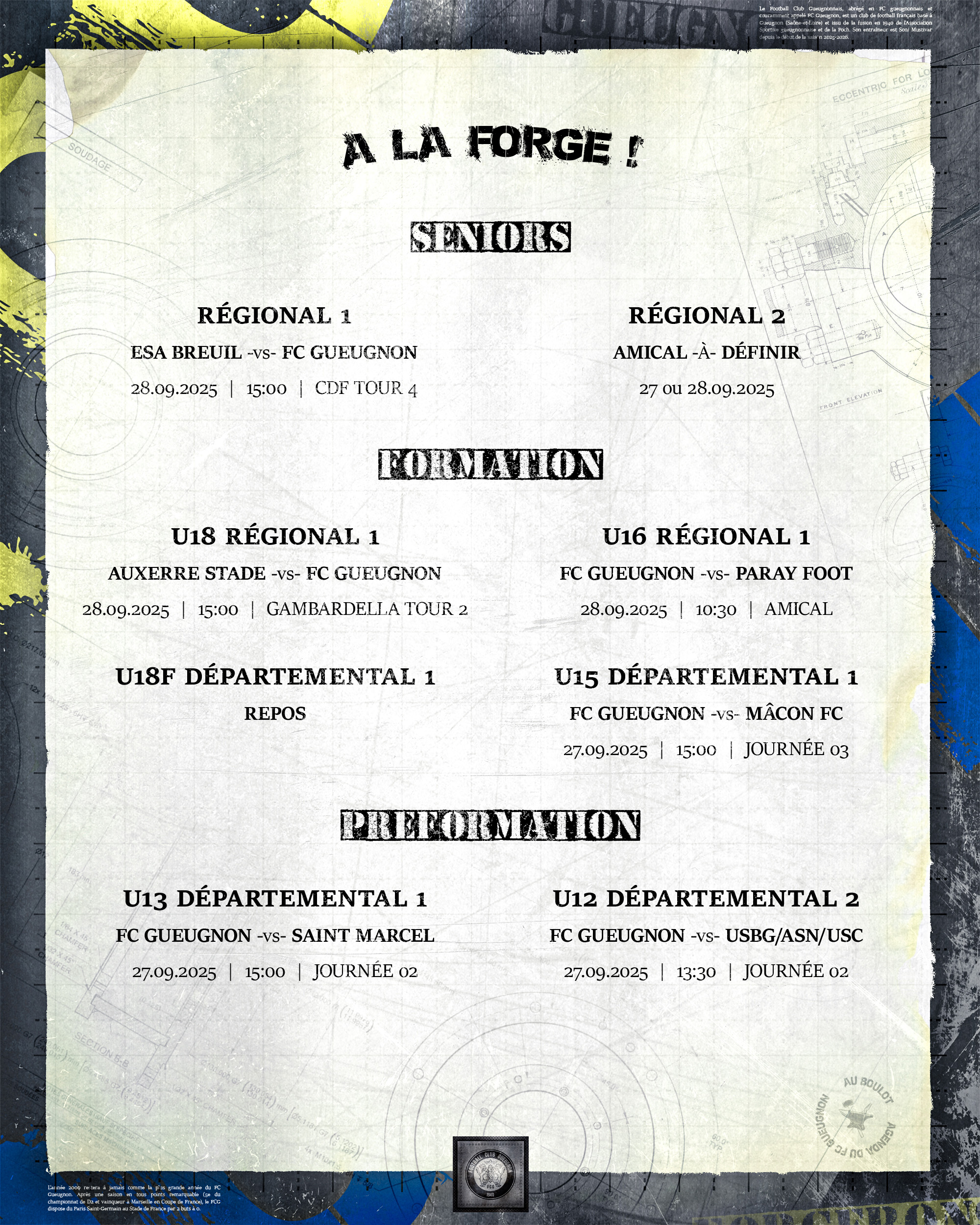 [Agenda] Weekend du 27 et 28 Septembre 2025 24 septembre 2025 Catégories News, News 2025/2026 #ForgeronFamily PLUS D'ACTUALITÉS... 14 novembre 2025[R1 J07 : FC Gueugnon – Saint-Apollinaire] Gueugnon à la relance à domicile !Lire 13 novembre 2025[Arbitrage] Deviens arbitre au FC Gueugnon !Lire 13 novembre 2025[R1 J07 : FC Gueugnon – Saint-Apollinaire] You Énergie : partenaire de la rencontreLire 12 novembre 2025[Agenda] Weekend du 15 et 16 Novembre 2025LireA LA UNE 1