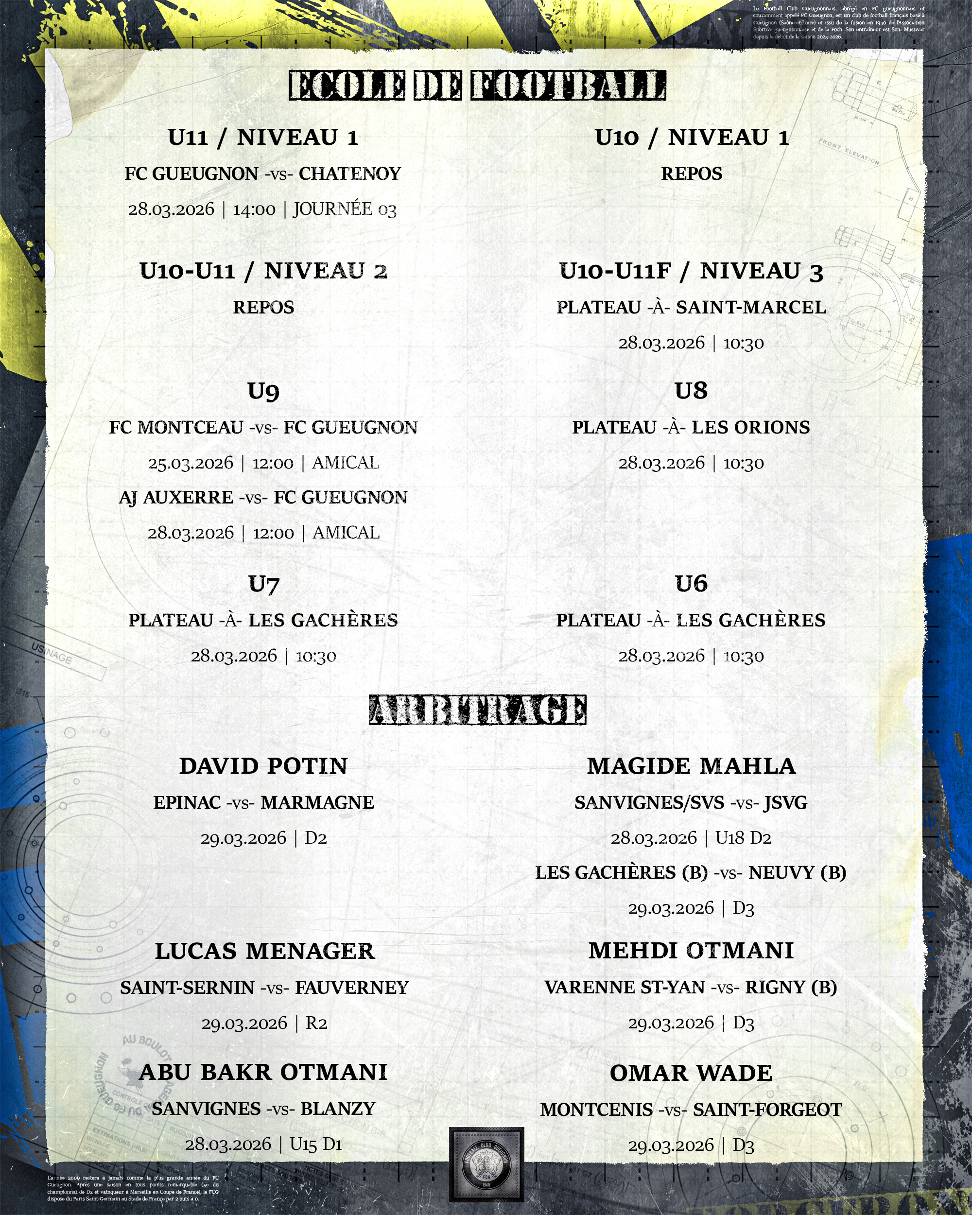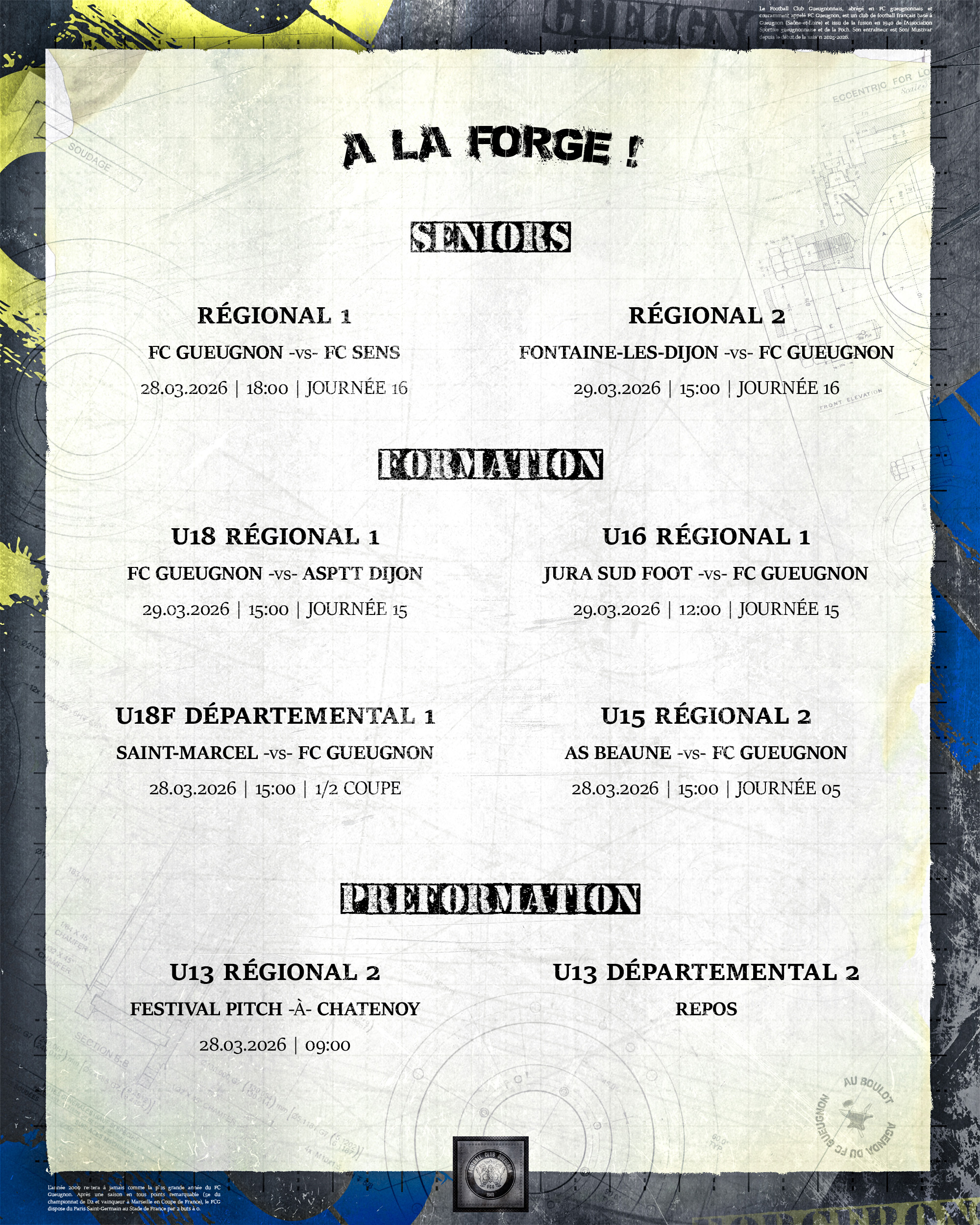 [Agenda] Weekend du 28 et 29 Mars 2026 25 mars 2026 Catégories News, News 2025/2026 #ForgeronFamily PLUS D'ACTUALITÉS... 25 mars 2026[Agenda] Weekend du 28 et 29 Mars 2026Lire 25 mars 2026[Podcast] Kévin DUPASQUIER: « Rendez-vous samedi à Jean Laville ! On vous attend nombreux au stade. »Lire 24 mars 2026[Académie] Inscriptions Sections Sportives – Lycée Camille Claudel à DigoinLire 23 mars 2026[R1 J15 : FC Montceau – FC Gueugnon] Flash ScoreLireA LA UNE 1