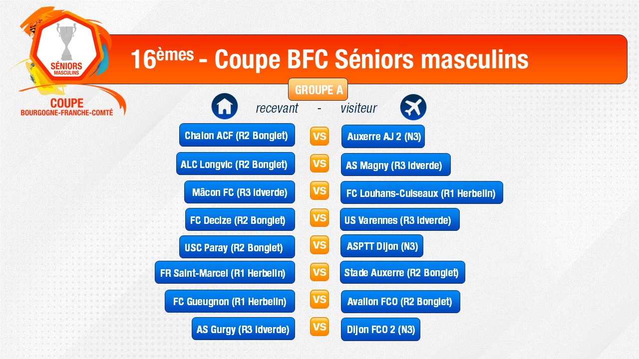Coupe Bourgogne Franche-Comté Seniors Masculins – 16es de finale : Notre équipe première affrontera le FCO Avallon (Régional 2 Bonglet) au Stade Jean Laville, une rencontre qui permettra au FCG de jouer devant ses supporters.