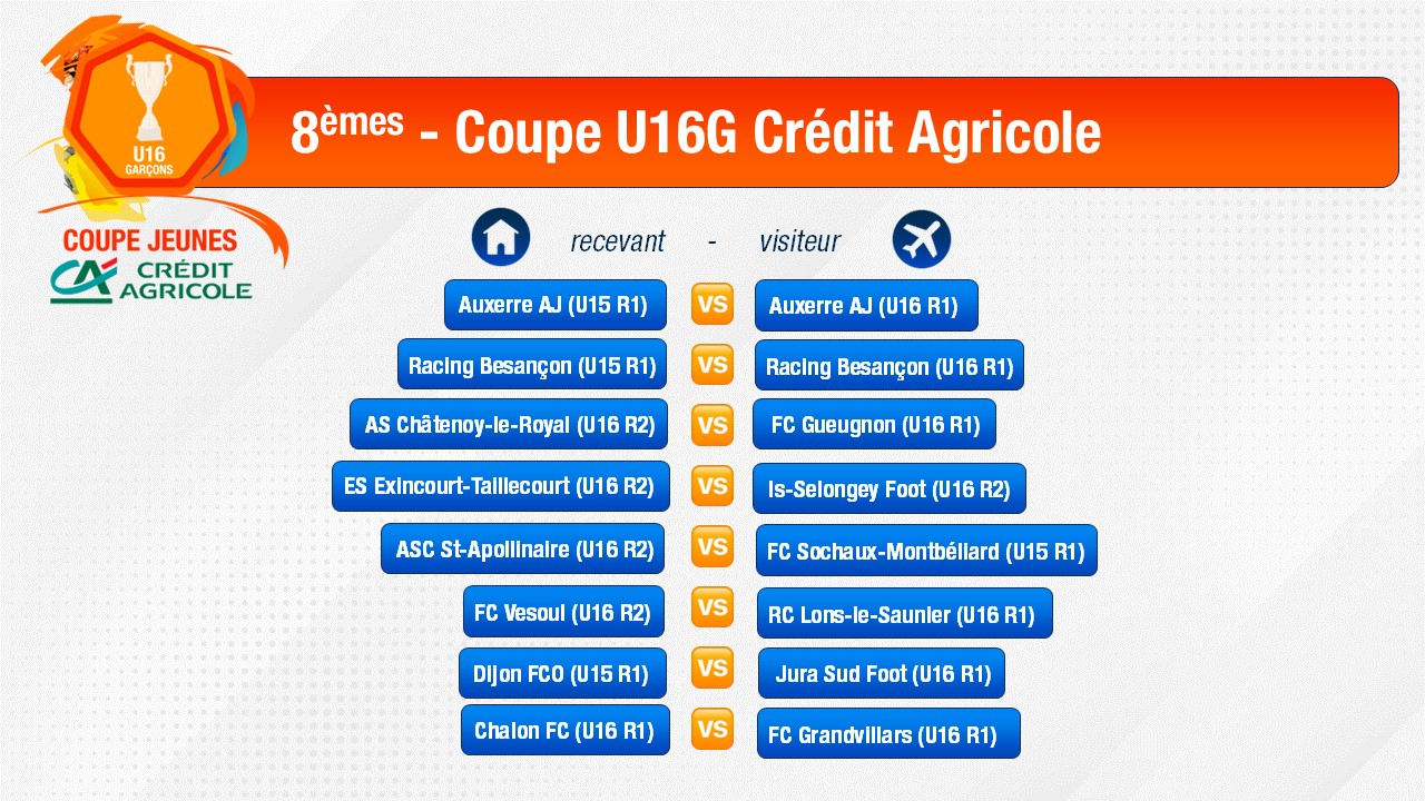 Coupe Bourgogne Franche-Comté U16G – 8es de finale : De leur côté, nos U16 se déplaceront sur la pelouse de l’AS Châtenoy-le-Royal, évoluant en U16 R2. Un déplacement à négocier avec sérieux pour espérer rejoindre les quarts de finale.