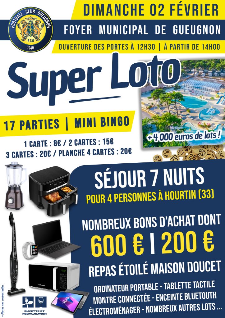Le FC Gueugnon vous invite à participer à son Loto qui se tiendra le dimanche 02 Février au Foyer Municipal de Gueugnon ! Tentez votre chance afin de gagner les différents lots mis en jeu d’une valeur totale de plus 4 000 euros :