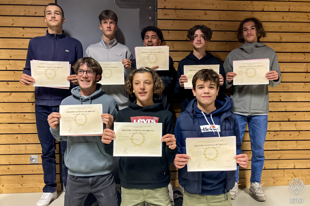 Entre séances d’entraînement sur le terrain et sessions de cours en classe, les jeunes de nos sections sportives sont encouragés à exceller dans deux domaines : scolaire et sportif. L’obtention du Brevet des Collèges est une étape cruciale dans la vie académique de chaque élève, marquant le passage vers de nouveaux horizons éducatifs et personnels. Pour nos neuf joueurs, ce diplôme prend une signification particulière car elle témoigne de leur détermination à exceller, tant dans leur vie scolaire que sur les terrains de football.