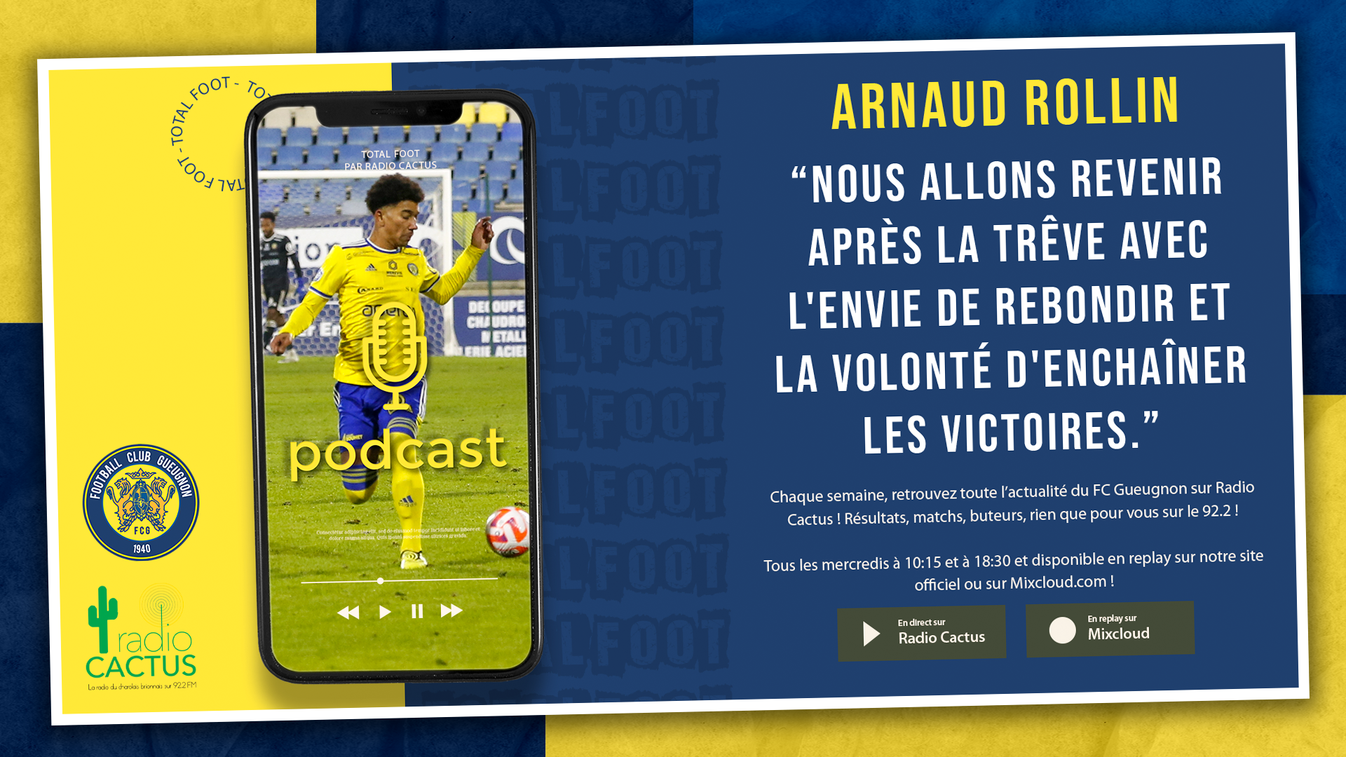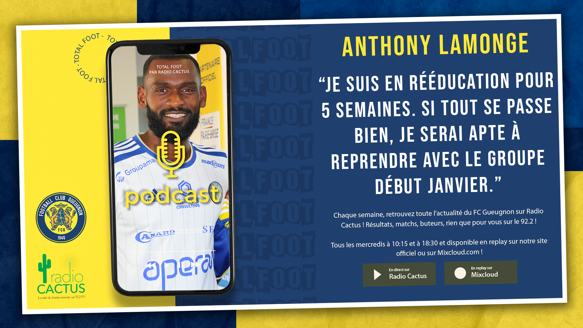 Chaque semaine, retrouvez toute l’actualité du FC Gueugnon sur Radio Cactus ! Résultats, matchs, buteurs, rien que pour vous sur le 92.2 ! L’émission Total Foot est disponible tous les mercredis à 10:15 et à 18:30 sur Radio Cactus (FM 92.2) mais aussi en replay sur notre site officiel ou sur Mixcloud.com ! Les intervenants …