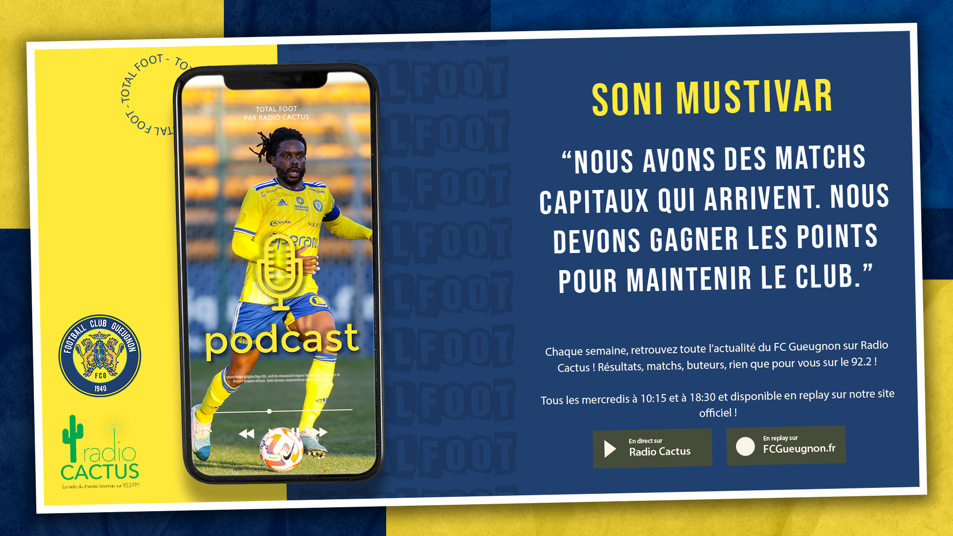 Chaque semaine, retrouvez toute l’actualité du FC Gueugnon sur Radio Cactus ! Résultats, matchs, buteurs, rien que pour vous sur le 92.2 ! L’émission Total Foot est disponible tous les mercredis à 10:15 et à 18:30 sur Radio Cactus (FM 92.2) mais aussi en replay sur notre site officiel ou sur Mixcloud.com ! Les intervenants …