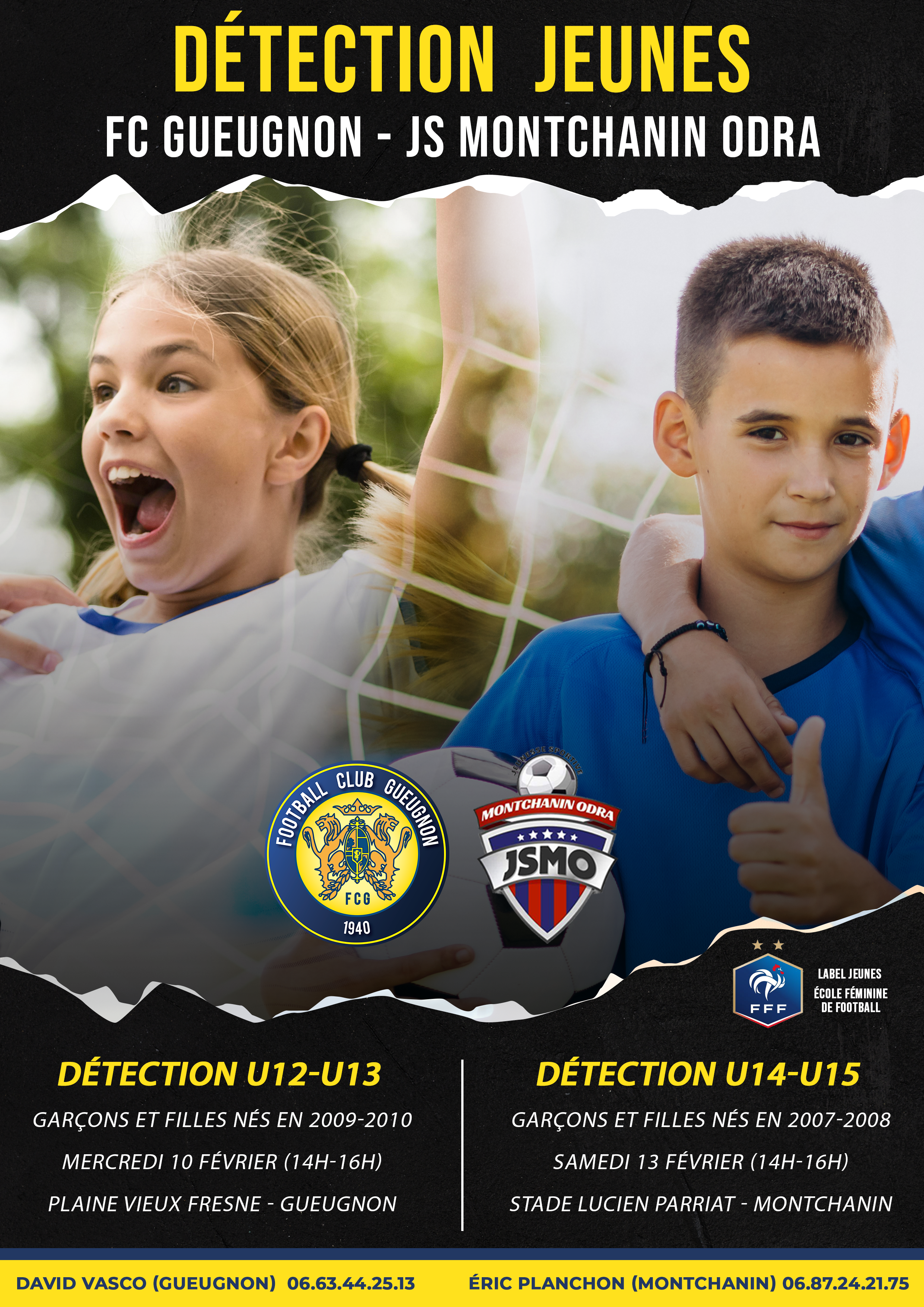 Dans le cadre du partenariat jeunes entre le FC Gueugnon et la JS Montchanin Odra, les deux clubs organisent des détections pour les joueurs / joueuses des catégories U12 à U15.