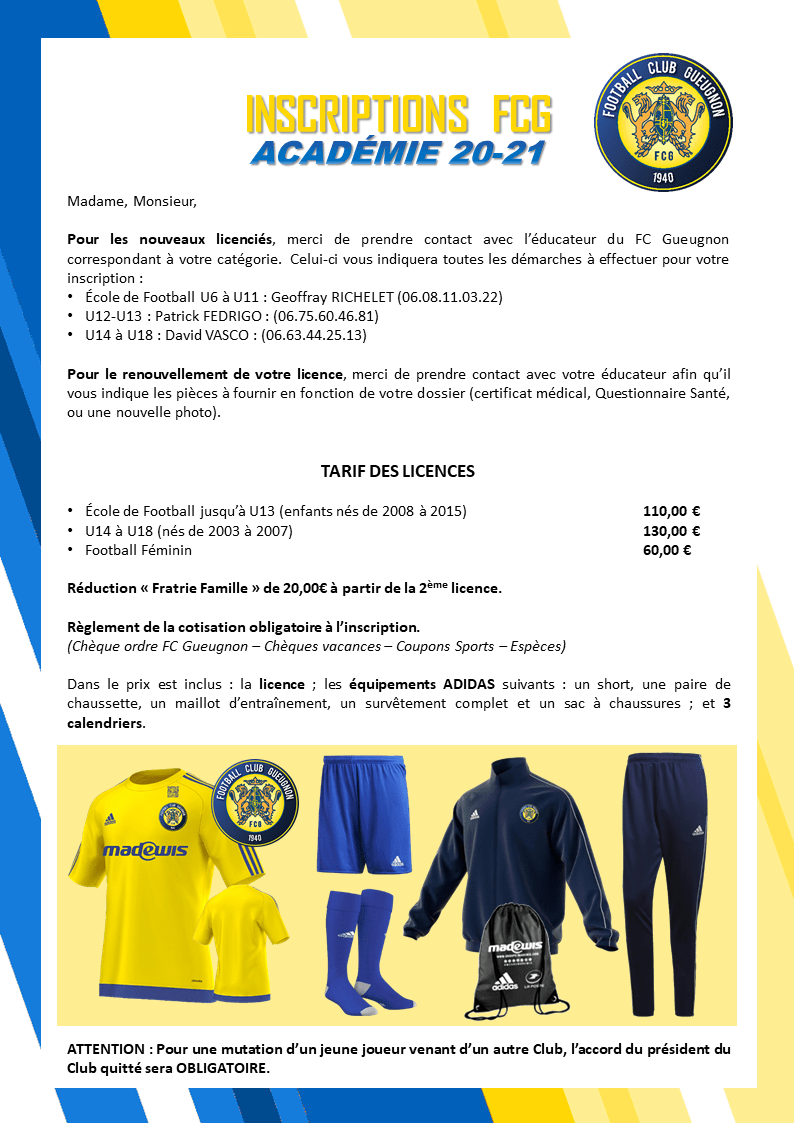 Pour les nouveaux licenciés, merci de prendre contact avec l’éducateur du FC Gueugnon correspondant à votre catégorie. Celui-ci vous indiquera toutes les démarches à effectuer pour votre inscription :