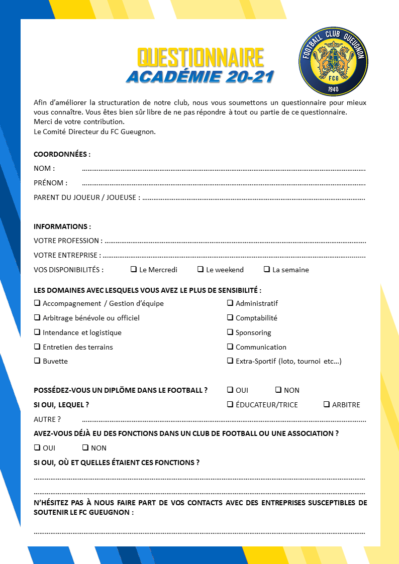 Règlement de la cotisation obligatoire à l’inscription. (Chèque ordre FC Gueugnon – Chèques vacances – Coupons Sports – Espèces)