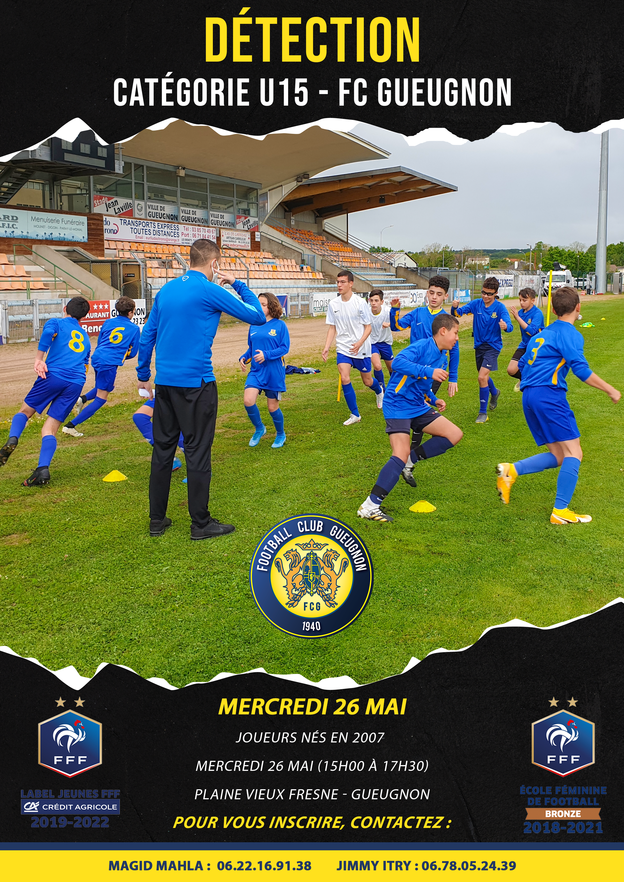 • Détection pour l’équipe U15 R1 (jeunes nés en 2007) : Mercredi 26 Mai de 15h00 à 17h30 – Plaine Vieux Fresne à Gueugnon