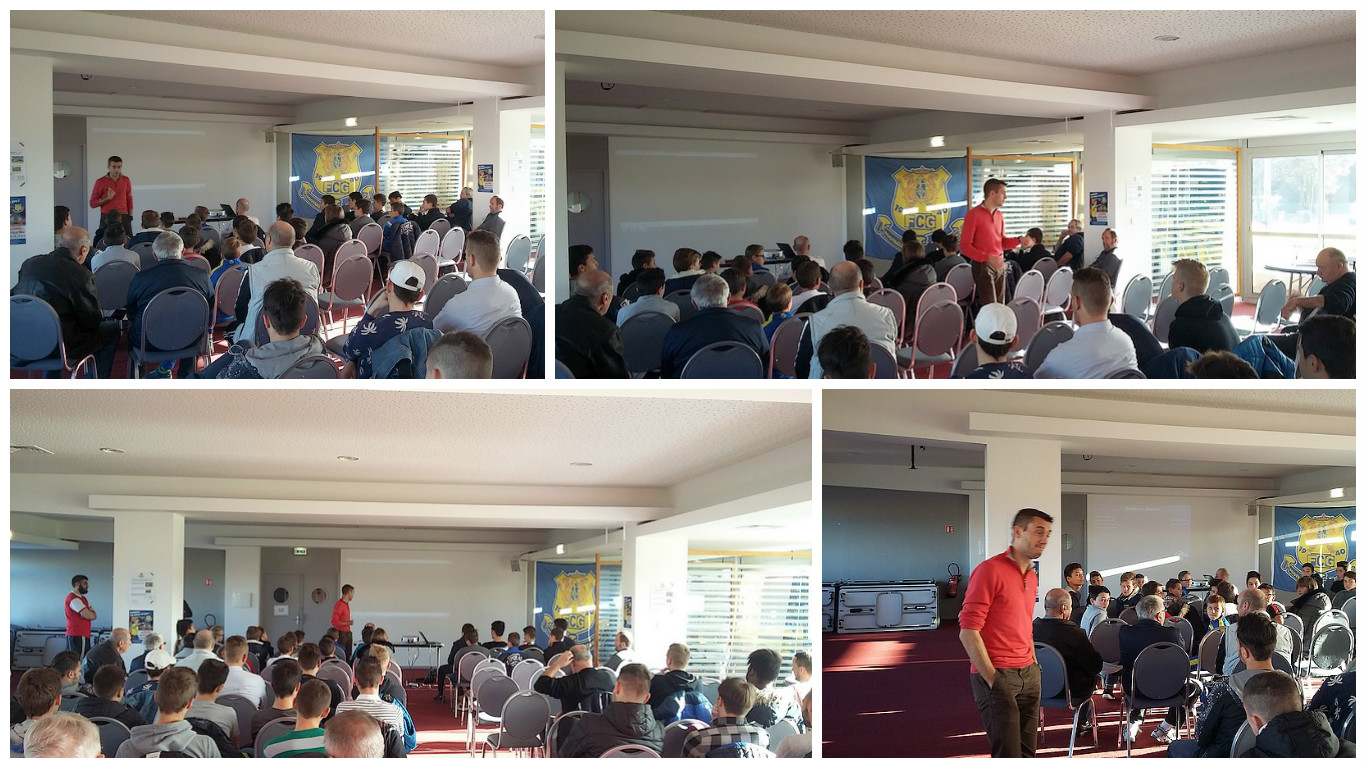 Ayant commencé à arbitrer dès l’âge de 15 ans, Clément Turpin est devenu aujourd’hui, et après 16 années de pratique, l’un de nos meilleurs arbitres tricolores, officiant régulièrement sur la scène internationale et récemment sélectionné pour l’EURO 2016 qui se déroulera en France. En permanence en échange avec son public, celui-ci fut conquis pendant près de deux heures par son charisme, sa passion et son humour. L’assistance, composée de jeunes licenciés, joueurs séniors, dirigeants, bénévoles et supporters, était transportée au fil des anecdotes de Cayenne à Pékin, de Paris à Istanbul ou encore du stade de France au stade Santiago Bernabeu lors de cette conférence qui s’est déroulée en deux temps, « deux mi-temps de 45 minutes ».
