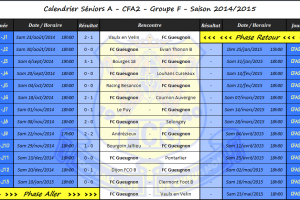 Au programme de nos équipes ce week-end Samedi 17 Janvier 2015 AMICAL SENIORS à l’Etrat (42) 14:00 : AS St Etienne 2 / Gueugnon FC CHAMPIONNAT HONNEUR U14 POULE UNIQUE Match reporté au 31 janvier 2015 Dimanche 18 Janvier 2015 U13 : TOURNOI CLUB JO CREUSOT en Salle 09:00 : Le Creusot Sont convoqués à 8h20 au stade …