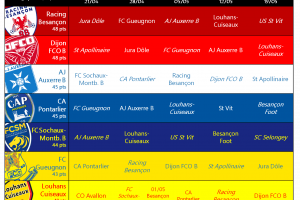 A 5 journées de la fin du championnat, 6 pour Louhans-Cuiseaux, nous vous proposons de retrouver d’un coup d’œil le calendrier des clubs pouvant mathématiquement encore jouer pour la montée en National 2. A noter la présence volontaire de la réserve du DFCO qui ne peut obtenir le précieux sésame à cause d’un centre de …