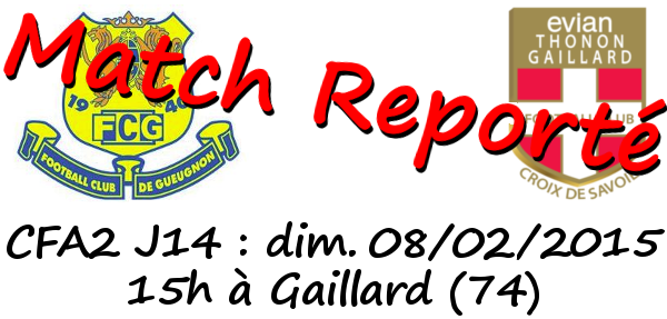 Attention, le match comptant pour la 14e journée de CFA2 qui devait avoir lieu ce dimanche 08/02 et opposait la réserve de l’Evian Thonon Gaillard FC au FCGueugnon est à nouveau reporté à une date ultérieure.