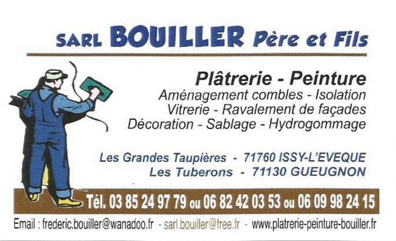 Leur entreprise familiale située à Issy l’Evêque, a été créée en 1939 par Charles Bouiller. Elle passe son savoir-faire à travers les générations. Elle intervient en neuf et en rénovation pour tous les travaux de peinture et de plâtrerie. Que ce soit pour la peinture en intérieur ou en extérieur, nous réalisons toutes vos demandes. Elle intervient également dans d’autres domaines d’activités comme l’isolation, la vitrerie, l’aménagement des combles et le revêtement de sols. Forts de notre expérience, nous vous proposons un travail sérieux et de qualité, notre but étant de satisfaire vos attentes.