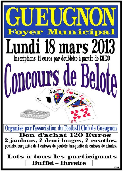 Le FC Gueugnon organise un concours de belote le lundi 18 mars 2013, à partir de 13h30, au foyer municipal de Gueugnon, concours richement doté, comme vous pourrez le découvrir sur le document ci-dessous …