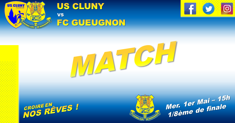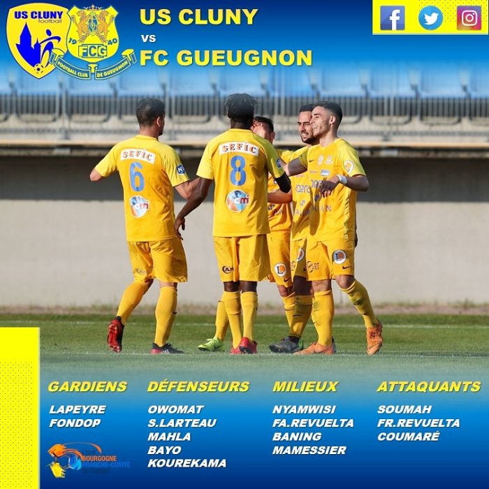 L’US-CLUNY Football évolue en R3 tout comme la réserve du FCG et occupe la 3ème place actuellement au classement avec 32 points. L’US Cluny à l’aller avait été battue péniblement par le FCG (2-1), c’était fin novembre face à des gueugnonnais qui jouaient à 10 dès le début du match. Ce dimanche à domicile, Cluny a pris sa revanche avec une victoire sans appel (3-0). En coupe de Bourgogne, on peut dire que les clunisois ont accompli plusieurs exploits en battant des clubs de 2 niveaux supérieurs : Quetigny, le FC Chalon et enfin l’ASPTT Dijon en 16e de finale, tous des clubs de R1. Ce match sera la cerise sur le gâteau pour cette équipe qui rêvait de recevoir une réserve pro ou une équipe comme celle du FCG qui opère en N3. En attendant l’US Cluny s’est replacée dans la course à la montée en revenant à 2 points du FCG. Les 3 buts clunisois ont été marqués par Orlando et David Pacheco et cela semble être une habitude… L’Us Cluny n’aura de toute façon rien à perdre.