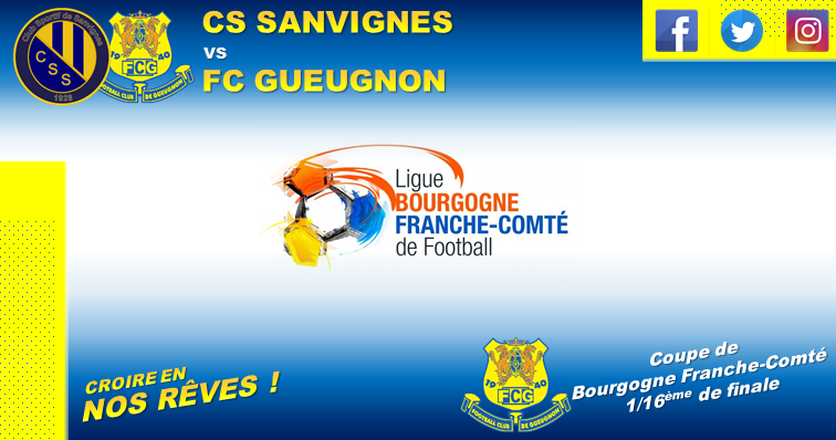 Le tirage du 1/16ème de finale de Coupe Bourgogne Franche-Comté a donné son vertict ! Les hommes de Philippe Correia débuteront la compétition par un déplacement chez nos voisins du CS Sanvignes. L’équipe entraînée par l’ancien gueugnonnais Lionel Martin pointe à la 6ème place du Classement Régional 2 (groupe B) avec un bilan équilibré de 4 victoires, 1 nul et 4 défaites.