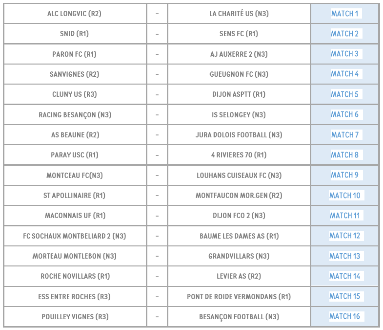 Le 1/16ème de finale de Coupe Bourgogne Franche-Comté se jouera le weekend du 09 et 10 Mars 2019 sur le terrain de Sanvignes.