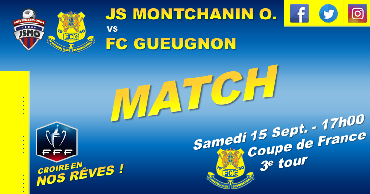 Le FC GUEUGNON a remporté samedi dernier son troisième match en quatre journées de championnat en s’imposant à domicile face à La Charité (3-1). Le contrat était ainsi rempli ! Avant de penser au prochain déplacement à Jura Dole, il faut dans un premier temps se projeter sur ce 3ème tour de la Coupe de France. Le Président Bernard CANARD l’a répété il y a peu, la Coupe demeure toujours un objectif cette saison. La perspective d’une belle affiche à Jean Laville fait toujours rêver. Pour cela, il faudra passer plusieurs tours, parfois délicats à gérer comme le passé l’a démontré. L’équipe de Montchain sera sur-motivée et il faudra aborder cette rencontre avec beaucoup de sérieux en espérant se mettre à l’abri le plus tôt possible. Auteurs d’un beau parcours la saison passée, les joueurs pourront se servir de leur expérience pour aborder se genre de match. Philippe CORREIA devrait à nouveau disposer d’un groupe presque au complet et pourrait permettre à certains joueurs d’avoir un temps de jeu plus conséquent. Il n’y aura qu’une ambition samedi soir, être au tirage au sort du 4ème tour !