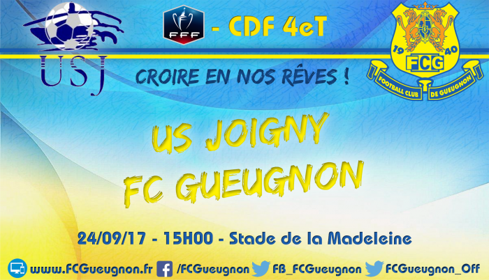 L’US JOIGNY FOOTBALL évolue en Régional 3 et avait terminé à la 3ème place la saison passée après des débuts difficiles. « L’intersaison contrairement à l’an passé s’est déroulée tout à fait calmement » aux dires de l’entraineur Jimmy DEGHAL et pour lui, l’objectif de la présente saison est de figurer sur le « podium ». Il soulignait : « Nous souhaitons rester dans la continuité de la deuxième partie de saison 2016-2017, où nous nous étions classés 3e (nous étions derniers en décembre) ». De plus, au chapitre des bonnes nouvelles, la création d’un synthétique est attendue. En attendant en championnat, Joigny a perdu la première rencontre à Nevers 2-1. En coupe, la qualification était un peu synonyme de revanche au stade de La Madeleine puisque Joigny se qualifiait contre Nevers 5-3 aux tirs au but (0-0). Sur sa lancée en championnat, Joigny a battu à domicile Corbigny 5-0 ! L’Yonne Républicaine titrait « Coupe de France 4ème tour, l’US Joigny recevra le mythique FC Gueugnon le 24 septembre ». Présenté comme cela, si l’on en doutait encore, le FCG sera attendu pour un match de gala.