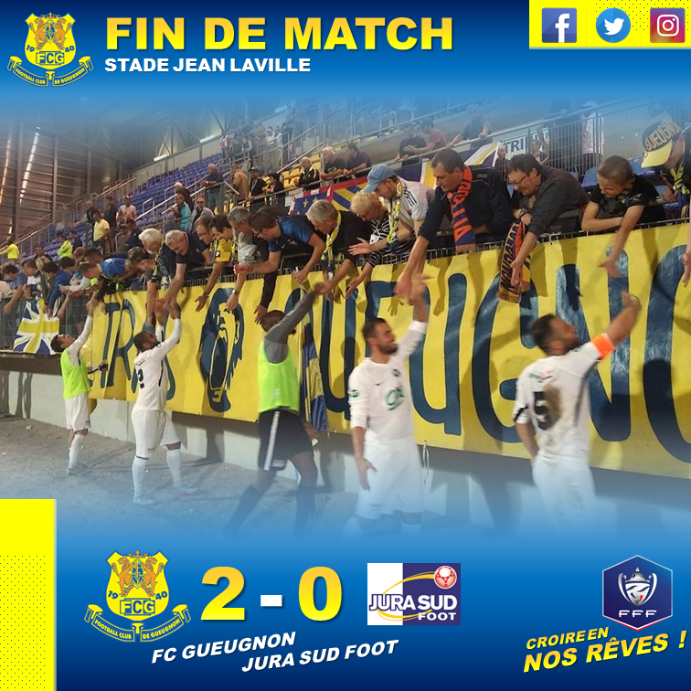 Malgré six minutes de temps additionnel, les gueugnonnais conservent leur avantage et décrochent ainsi leur qualification pour le 6ème tour de la Coupe de France face à un adversaire évoluant en National 2 ! Le 6ème tour aura lieu le week-end des 27-28 octobre.
