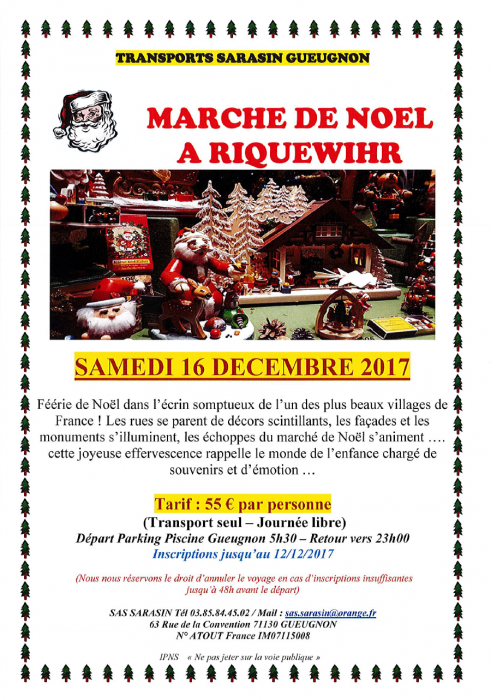 Outre leurs activités de transport touristique, transport en autocar, location de minibus, la SAS SARASIN propose également des transports Taxi, VSL, ambulances pour vos déplacements individuels. La compagnie organise également des voyages en France et en Europe comme le samedi 16 décembre prochain au marché de noël de Riquewihr !