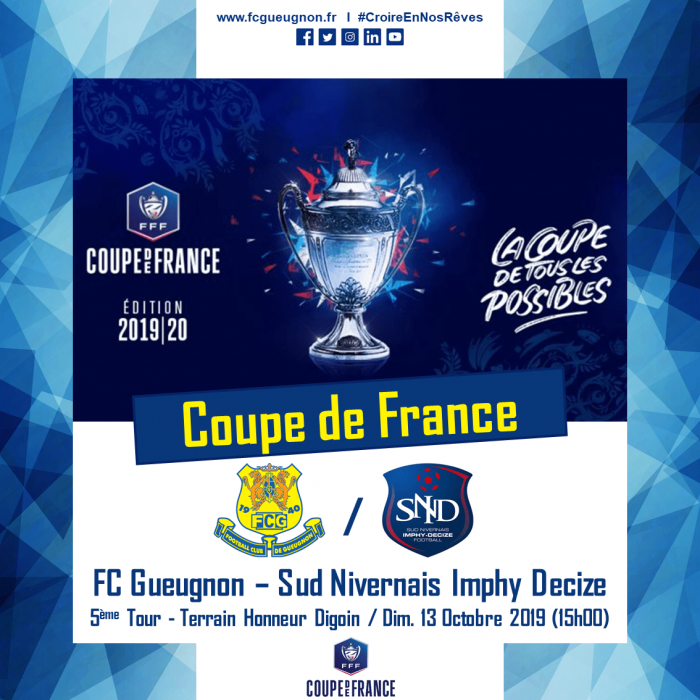 Dès lors, le staff du FC Gueugnon a cherché une solution de repli et c’est la ville et le club de Digoin qui nous ont fait l’honneur de nous accueillir le dimanche 13 octobre à 15h pour la réception du SNID (R1) dans le cadre du 5e tour de coupe de France. Les démarches administratives sont en cours avec le service « Compétitions » de la Ligue de Bourgogne Franche-Comté et Michel Nageotte (responsable de la compétition), ainsi que la Ville de Digoin.