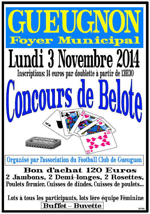 Ce lundi 3 novembre à partir de 13h30, la Commission des activités « Extra-Sportive » organise son concours de belote au foyer municipal. Avec des dotations intéressantes, tous les participants seront récompensés dans une ambiance sympathique au sein du très agréable foyer municipal.
