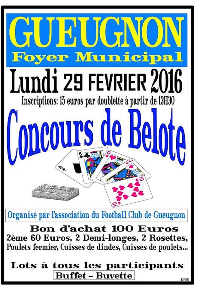 Lundi 29 février 2016 à partir de 13h30, la Commission des activités « Extra-Sportive » organise son concours de belote au foyer municipal. Avec des dotations intéressantes, tous les participants seront récompensés dans une ambiance sympathique au sein du très agréable foyer municipal.