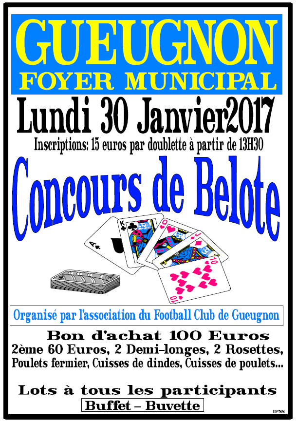Lundi 30 janvier 2017 à partir de 13h30, la Commission des activités « Extra-Sportive » organise son concours de belote au foyer municipal. Avec diverses dotations, tous les participants seront récompensés dans une ambiance sympathique au sein du très agréable foyer municipal.