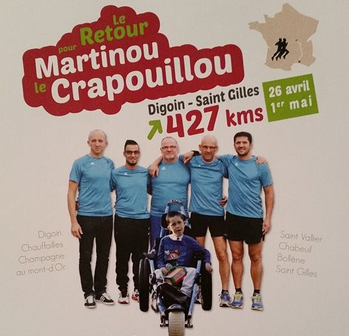 Martin est un petit garçon de 8 ans atteint d’une forme de myopathie : la « dystrophie congénitale non étiqueté ». Sylvain, Cédric, Jean-Luc, Didier et leur accompagnateur Gino se sont lancés le pari fou de rejoindre, en courant, « Martinou le Crapouillou » chez lui à Saint-Gilles dans le Gard. Ce défi de 5 étapes pour un total de 427 kilomètres a pour principal objectif de récolter des fonds pour soutenir Martin et sa famille.