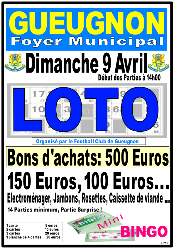 [Extra-Sportif] LOTO du FCGueugnon le dimanche 09 avril au Foyer Municipal