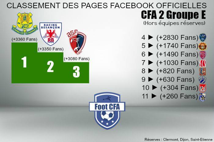 Ce mercredi, la page Facebook Foot CFA a réalisé un classement par nombres de fans des différentes pages officielles des clubs en CFA2. Dans le groupe E, c’est notre #TeamFogeron qui arrive en tête avec plus de 3360 fans !