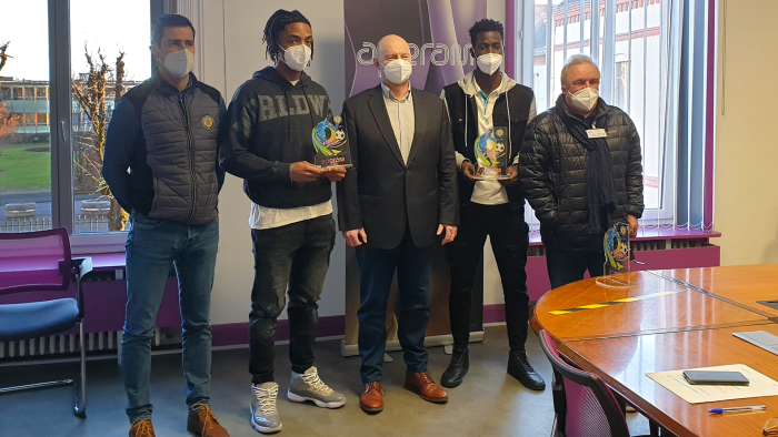 À l’issue de vos votes, Mouhamed Diallo, milieu de terrain, et Marly Rampont, défenseur, ont respectivement reçu le trophée de Forgeron du mois de novembre et décembre. Un grand merci à Aperam pour leur accueil, leur gentillesse et leur générosité.