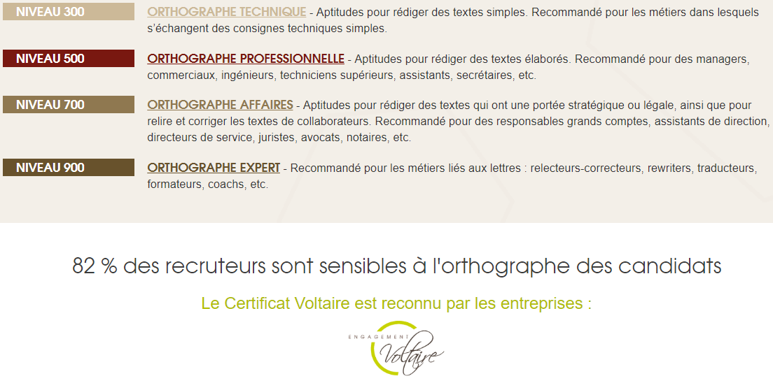 La mention « orthographe irréprochable » est souvent présente sur les offres d’emploi. Faire figurer sur son CV le score obtenu au Certificat Voltaire est aujourd’hui un atout. Cet examen, de plus en plus en reconnu dans le monde du travail, permet d’attester son niveau de français.