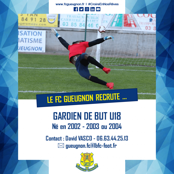 Afin de compléter son effectif U18, le FC Gueugnon recherche un Gardien de But né en 2002, 2003 ou 2004. Il participera aux rencontres de Championnat D1 ainsi qu’à la Coupe Gambardella. D’autre part, des spécifiques Gardien de But sont proposés chaque semaine par les éducateurs et gardiens de l’Équipe première.