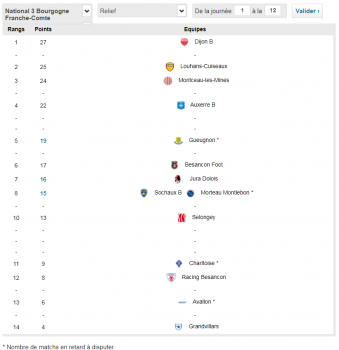 Avec 5 victoires, 4 nuls, 2 défaites et 1 match en retard, les séniors A comptent 19 points soit 8 de retard sur la réserve du DFCO actuelle leader du championnat mais qui ne peut prétendre au National 2.
